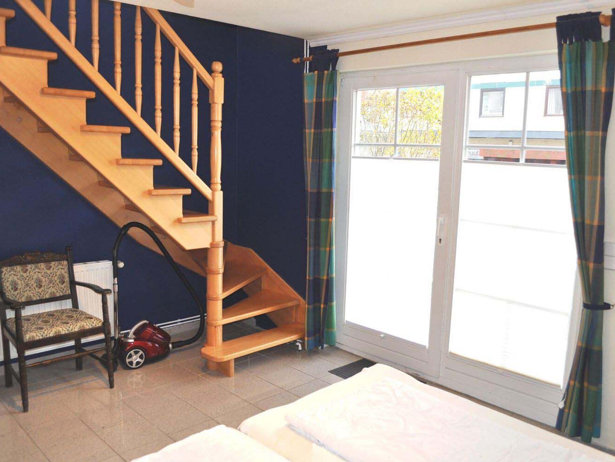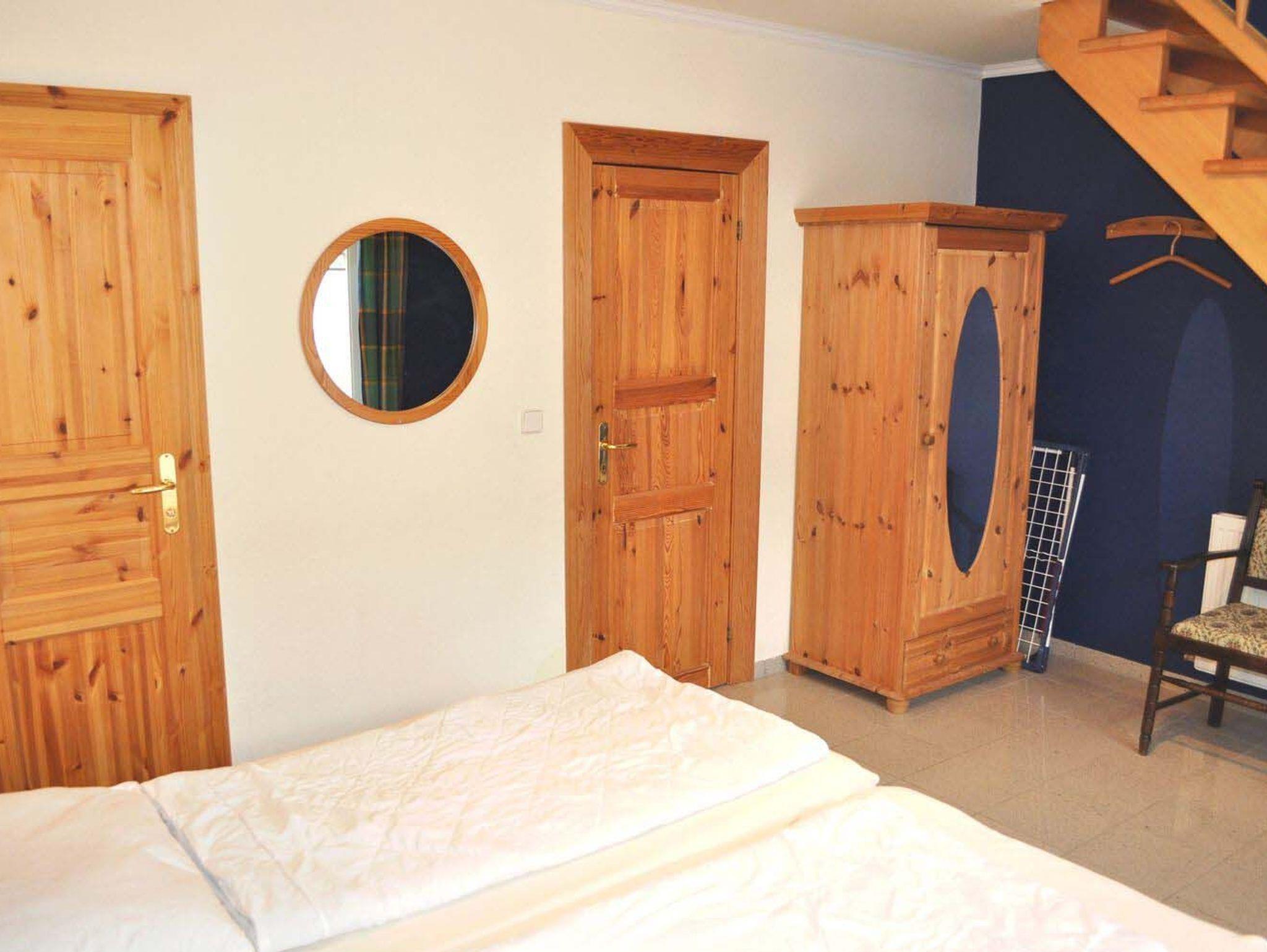 Schlafzimmer 1: 2 Matratzen, 2 Spiegel, 2 Tischlampen, Bügeleisen, Doppelbett 2,00 x 1,80 m, Kleiderschrank, Kommode, Nachttisch, Plissees, Sonnenschirm, Staubsauger, Stuhl, Treppe nach oben, Wäscheständer, Wischer mit Eimer