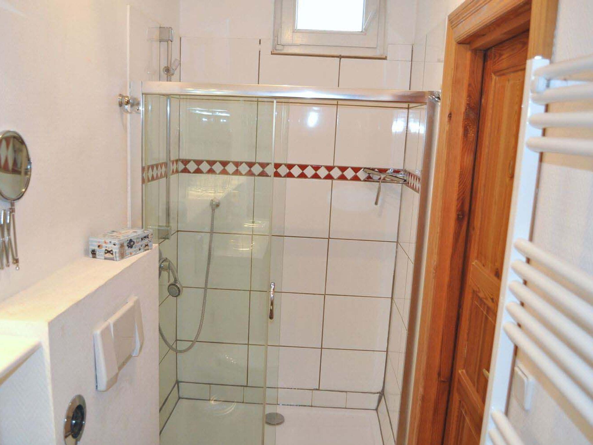 Bad 1: Dusche, Duschkabine, Fön, Handtuchheizung, Kosmetikspiegel, Spiegel, Waschtisch mit Unterschrank, WC