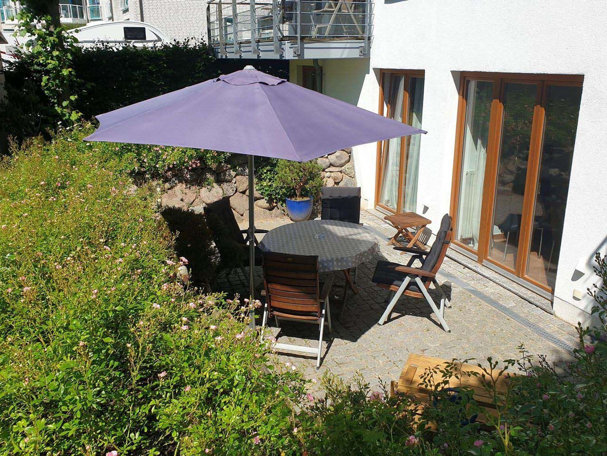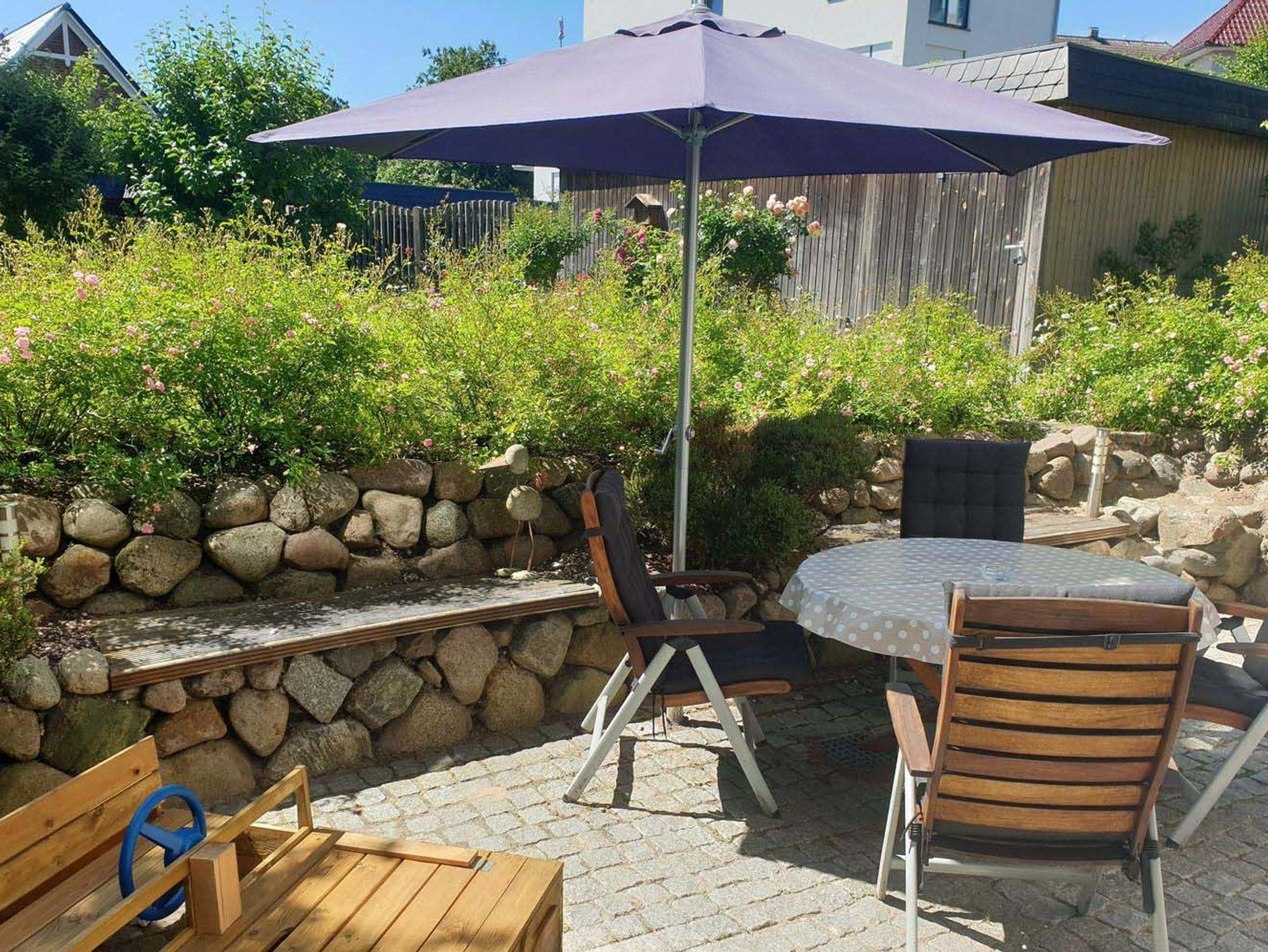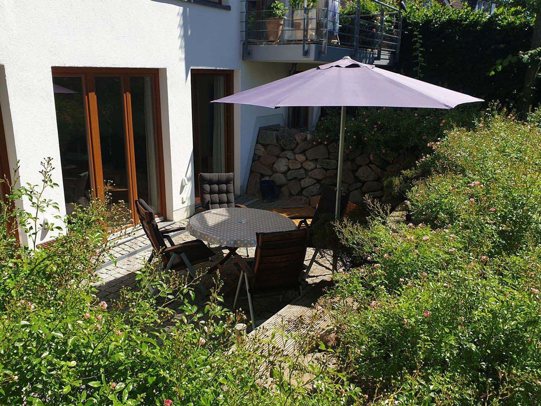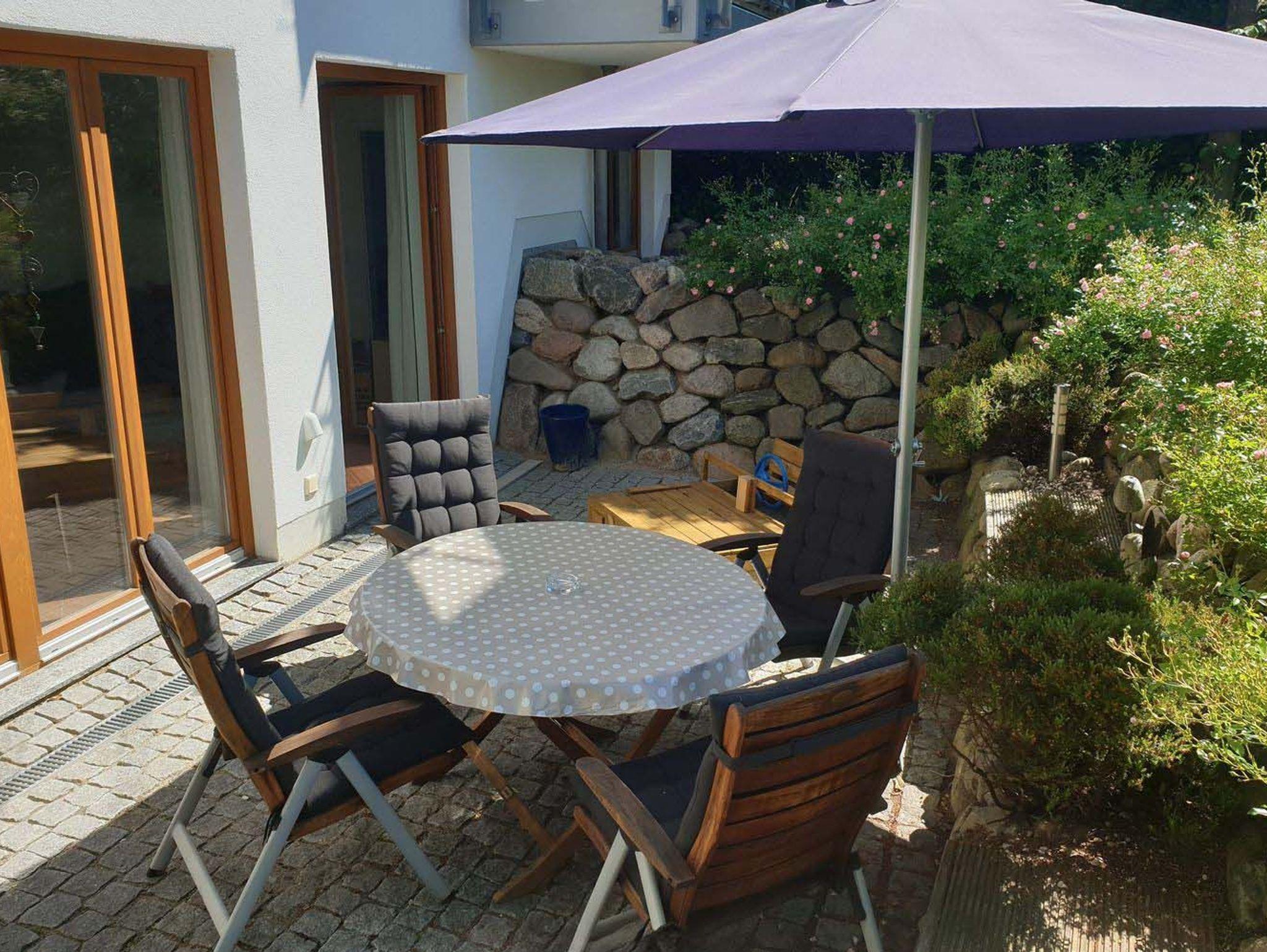 Terrasse: 4 Stühle, Sonnenschirm, Spielkiste, Tisch, Westlage