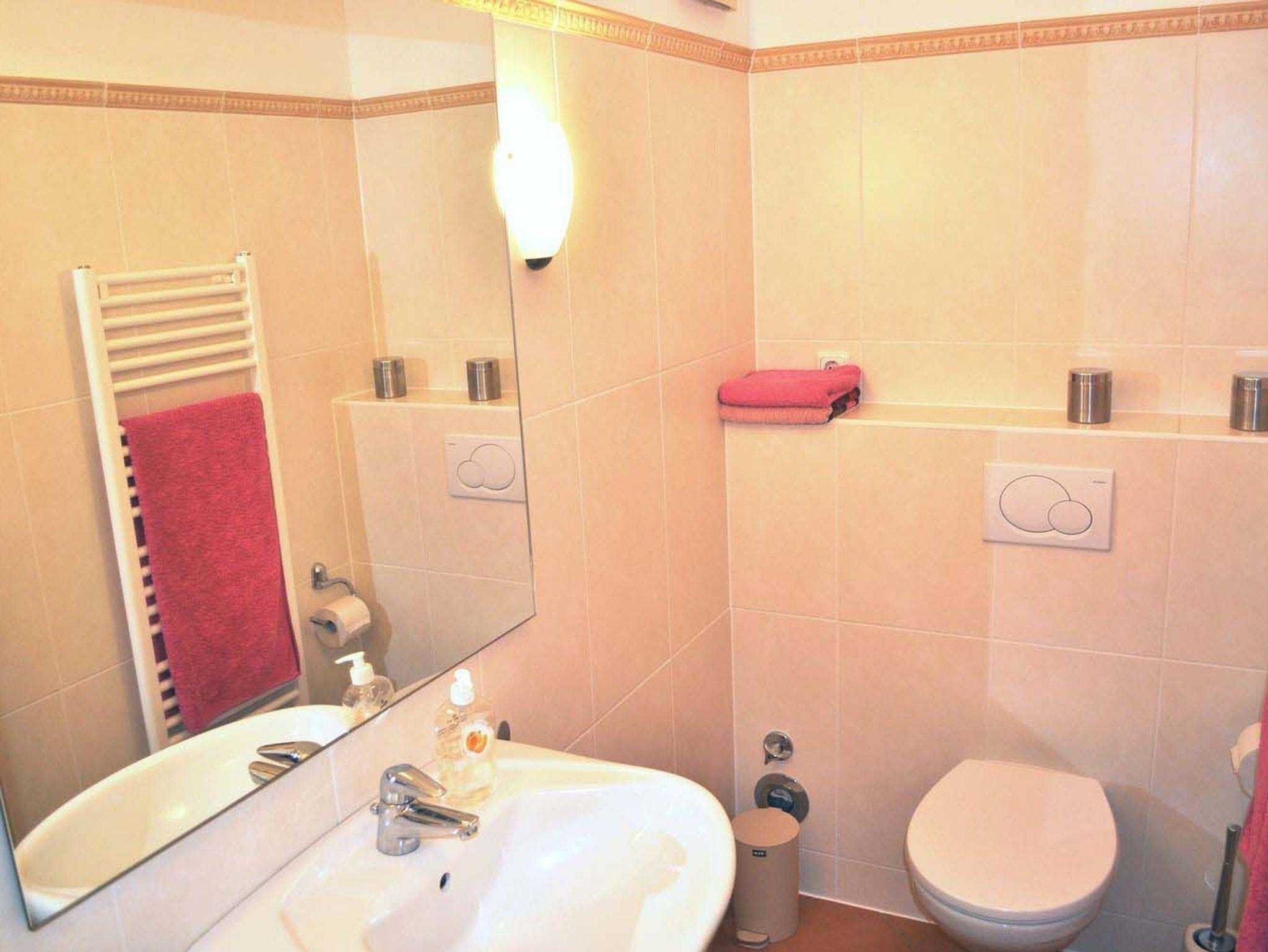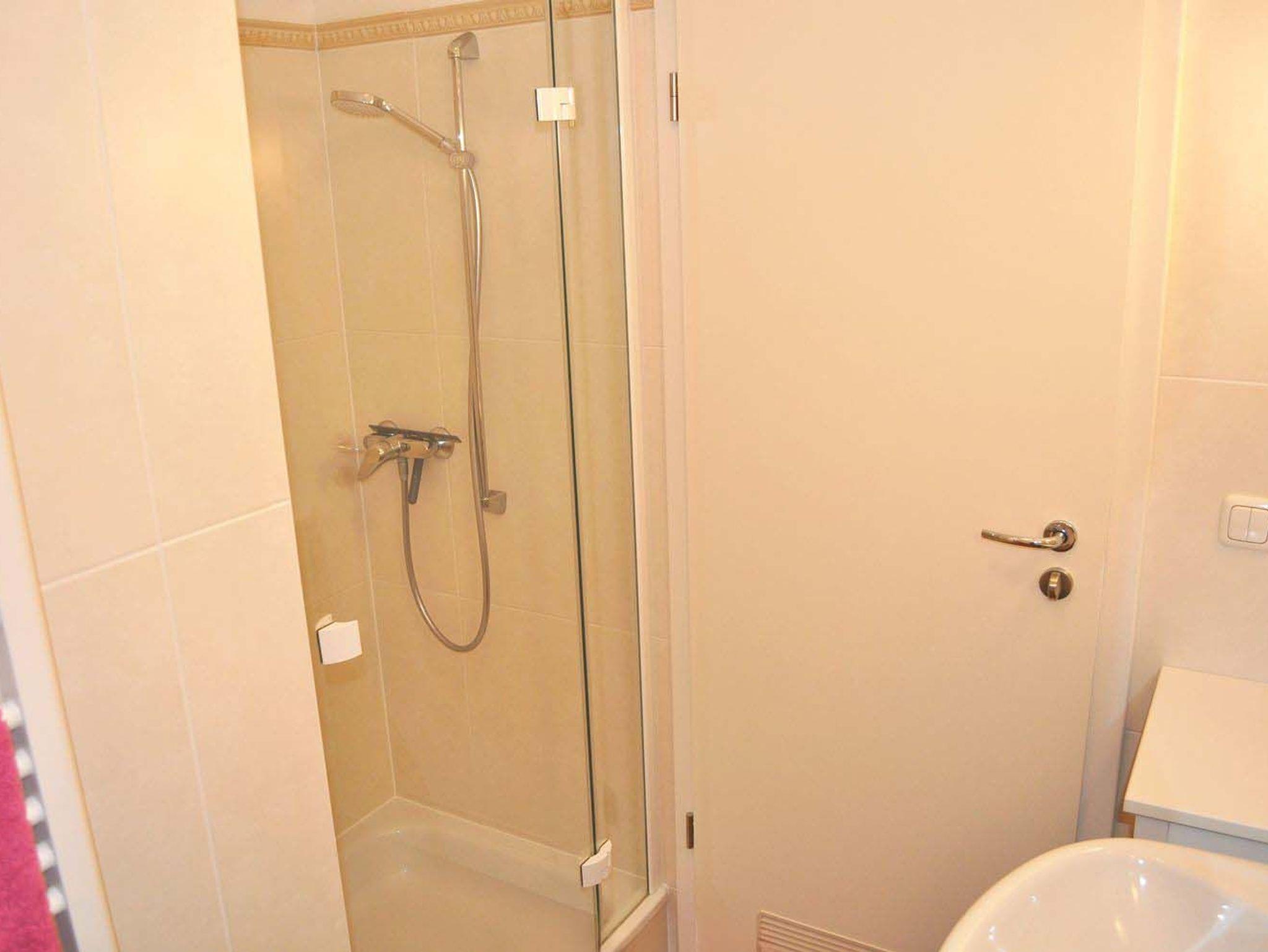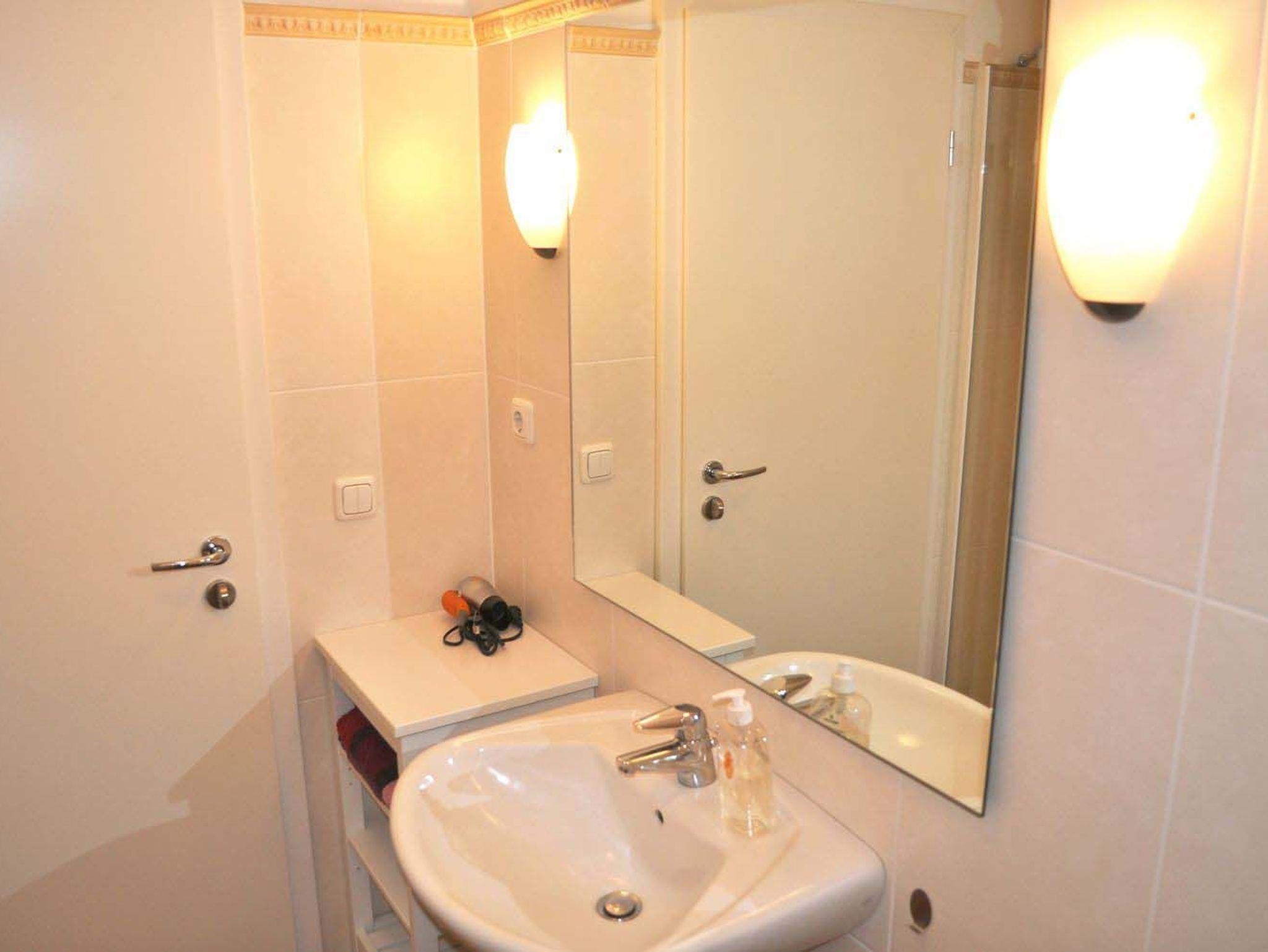 Bad 1: Dusche, Duschkabine, Fön, Regal, Spiegel, Waschbecken, WC