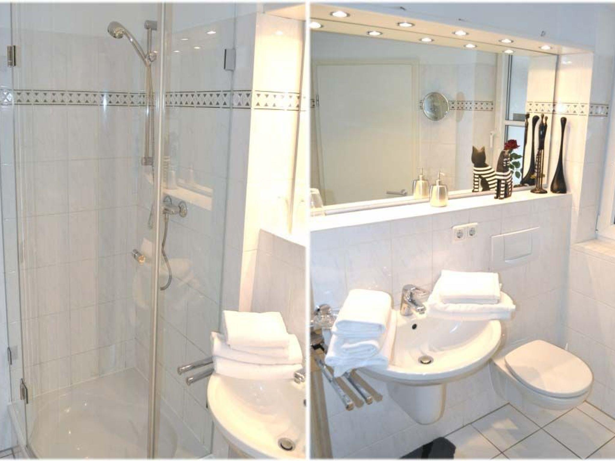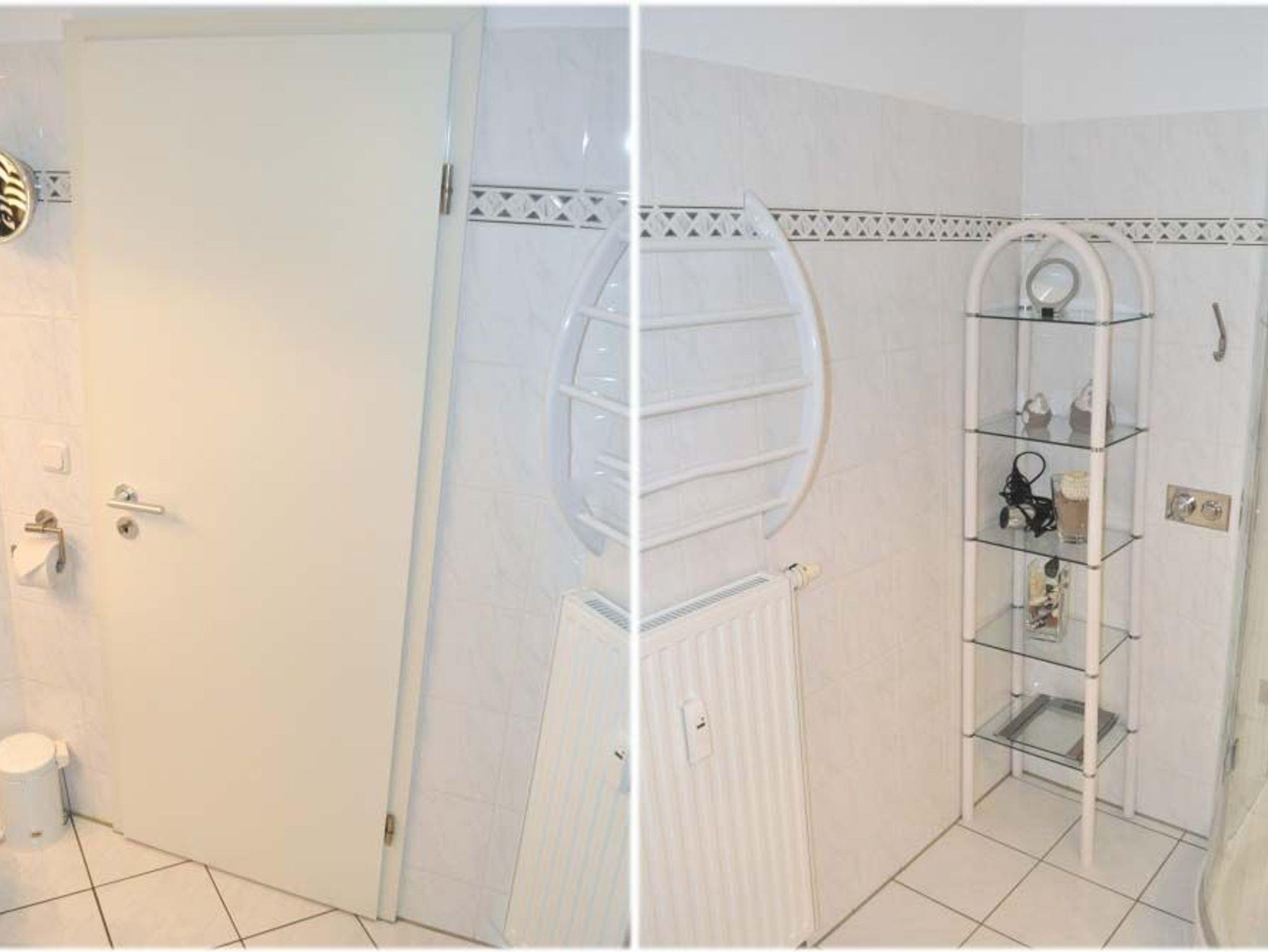 Bad 1: Dusche, Duschkabine, Fön, Kosmetikspiegel, Regal, Spiegel, Stuhl, Waschbecken, WC
