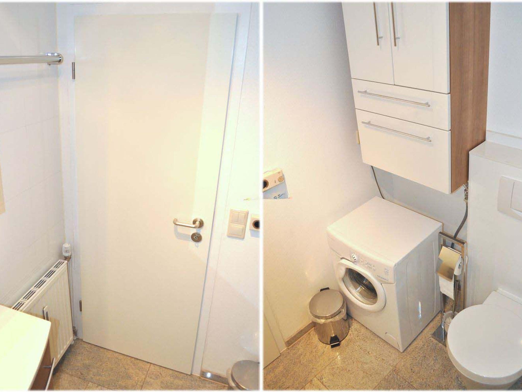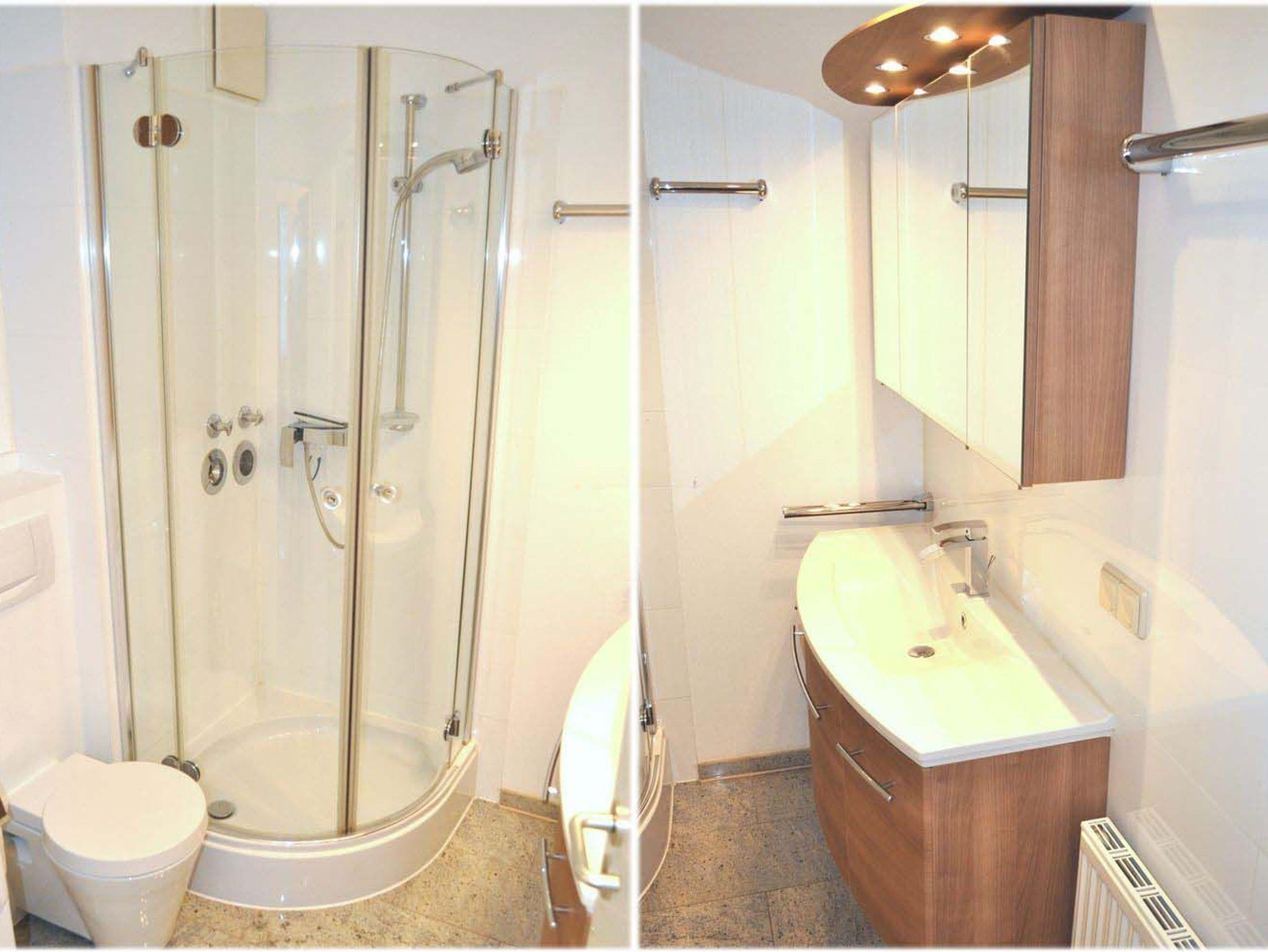 Bad 1: Dusche, Duschkabine, Fön, Hängeschrank, Spiegelschrank, Waschmaschine, Waschtisch mit Unterschrank, WC