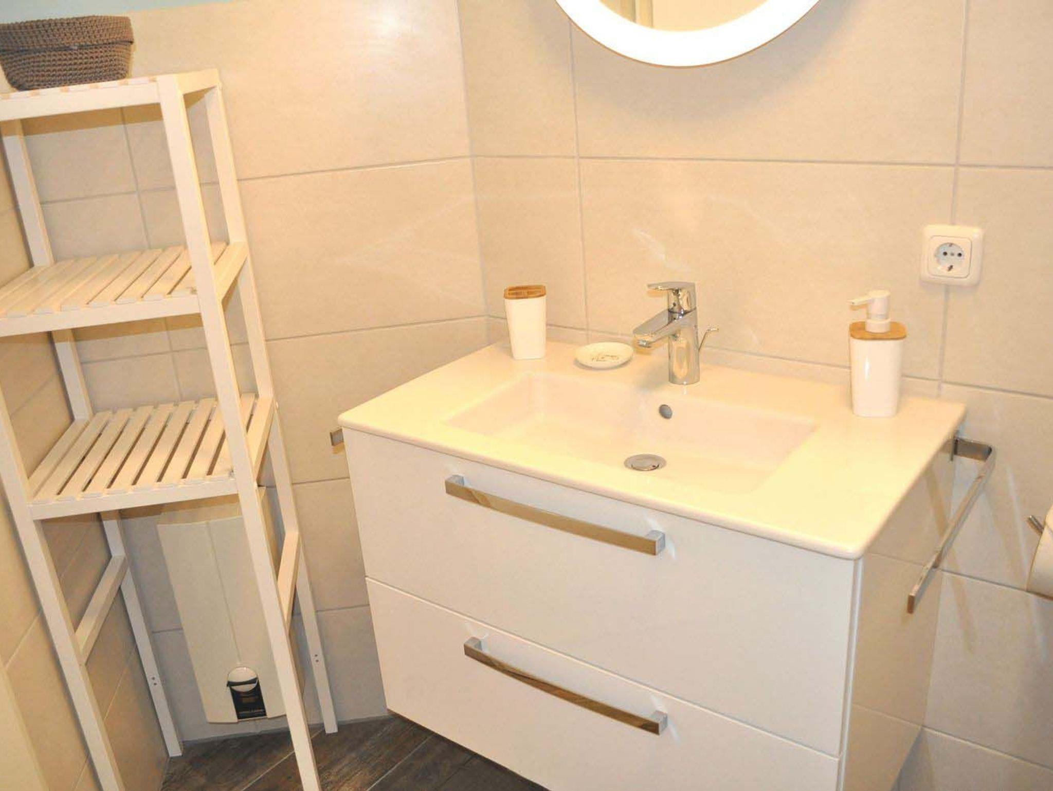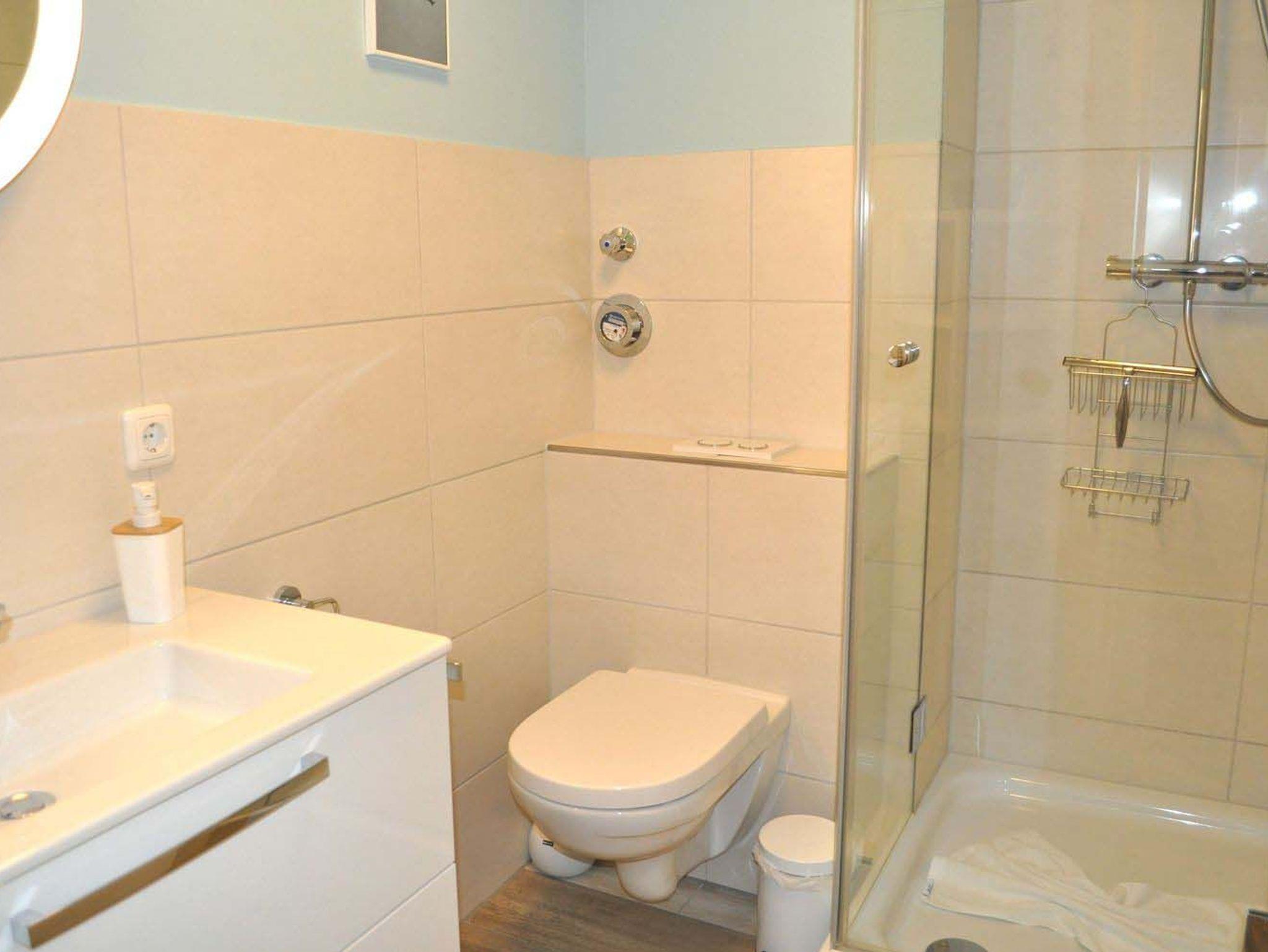 Bad 1: Dusche, Duschkabine, Fön, Handtuchheizung, Regale, Spiegel, Waschtisch, WC