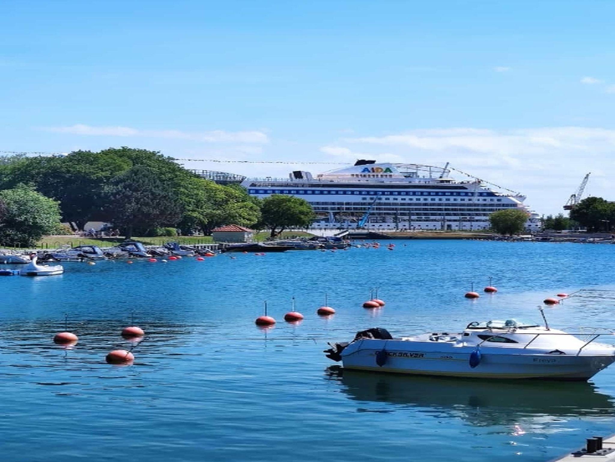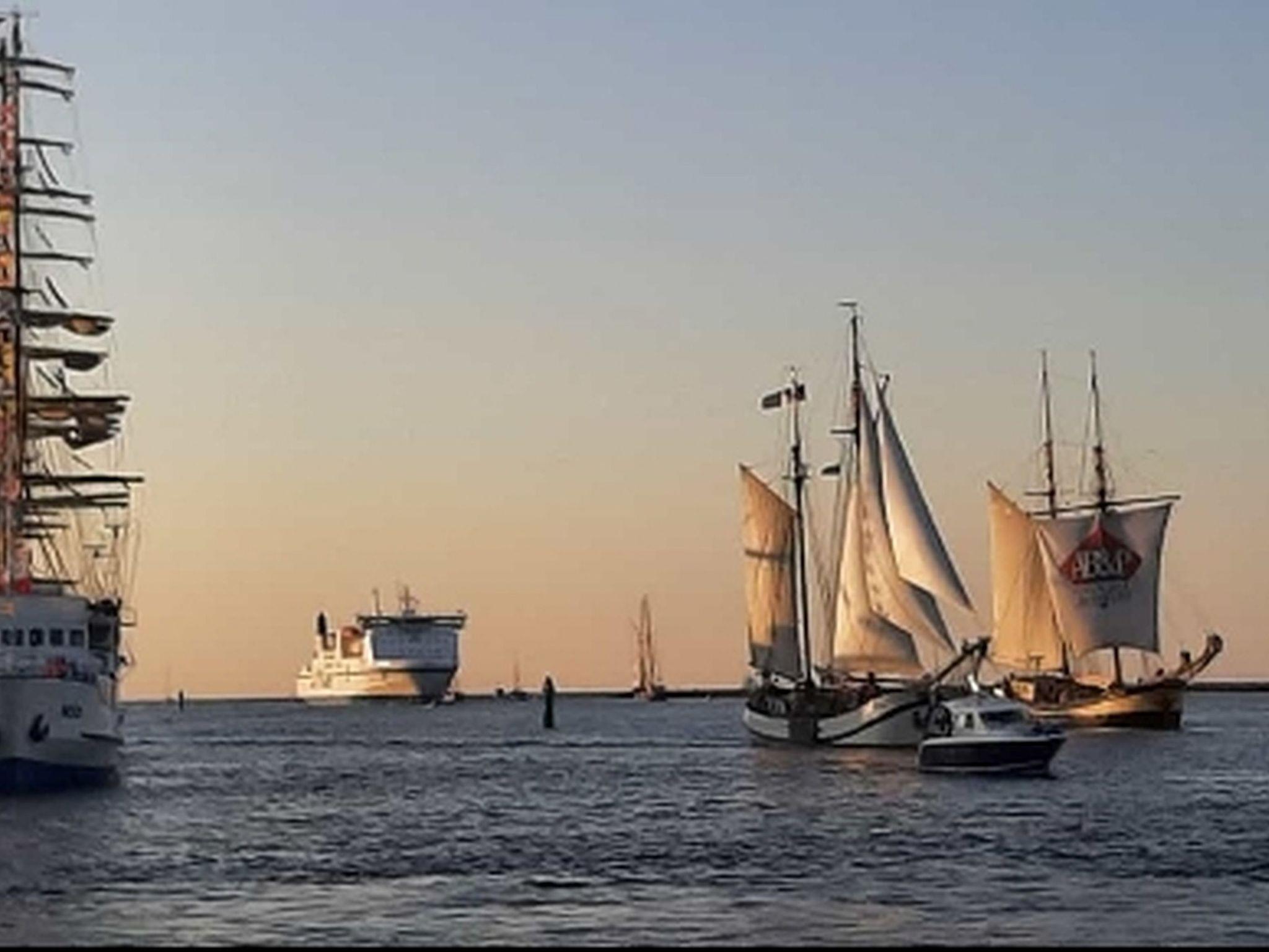 ca.750m. Dort können Sie den Schiffsverkehr von und aus Warnemünde beobachten.