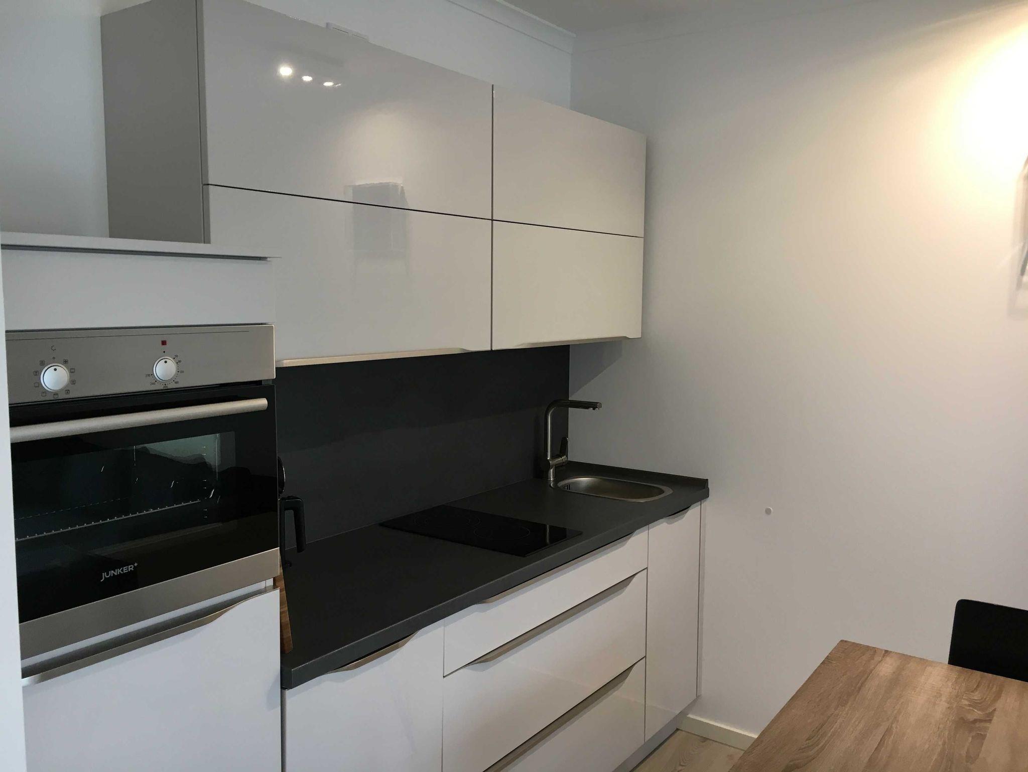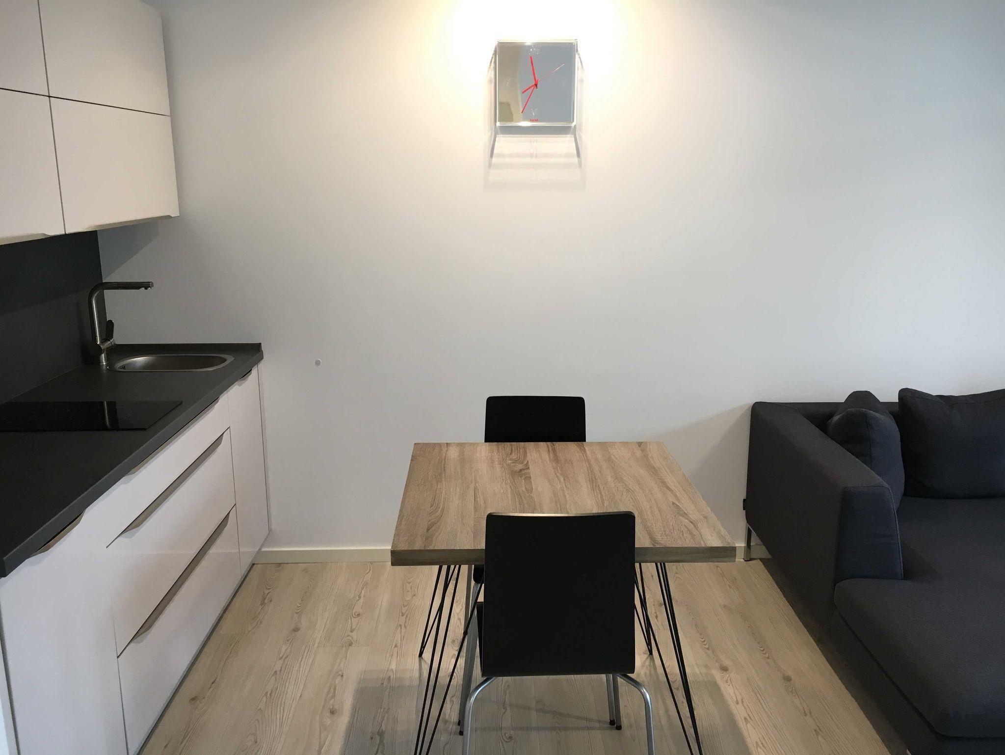 40 m² 2-Raum-Wohnung, Ausgang zur Sonnenterrasse von Wohnzimmer und Schlafraum. Offener Wohn-/Kochbereich mit Esstisch und Einbauküche mit vielen Extras.