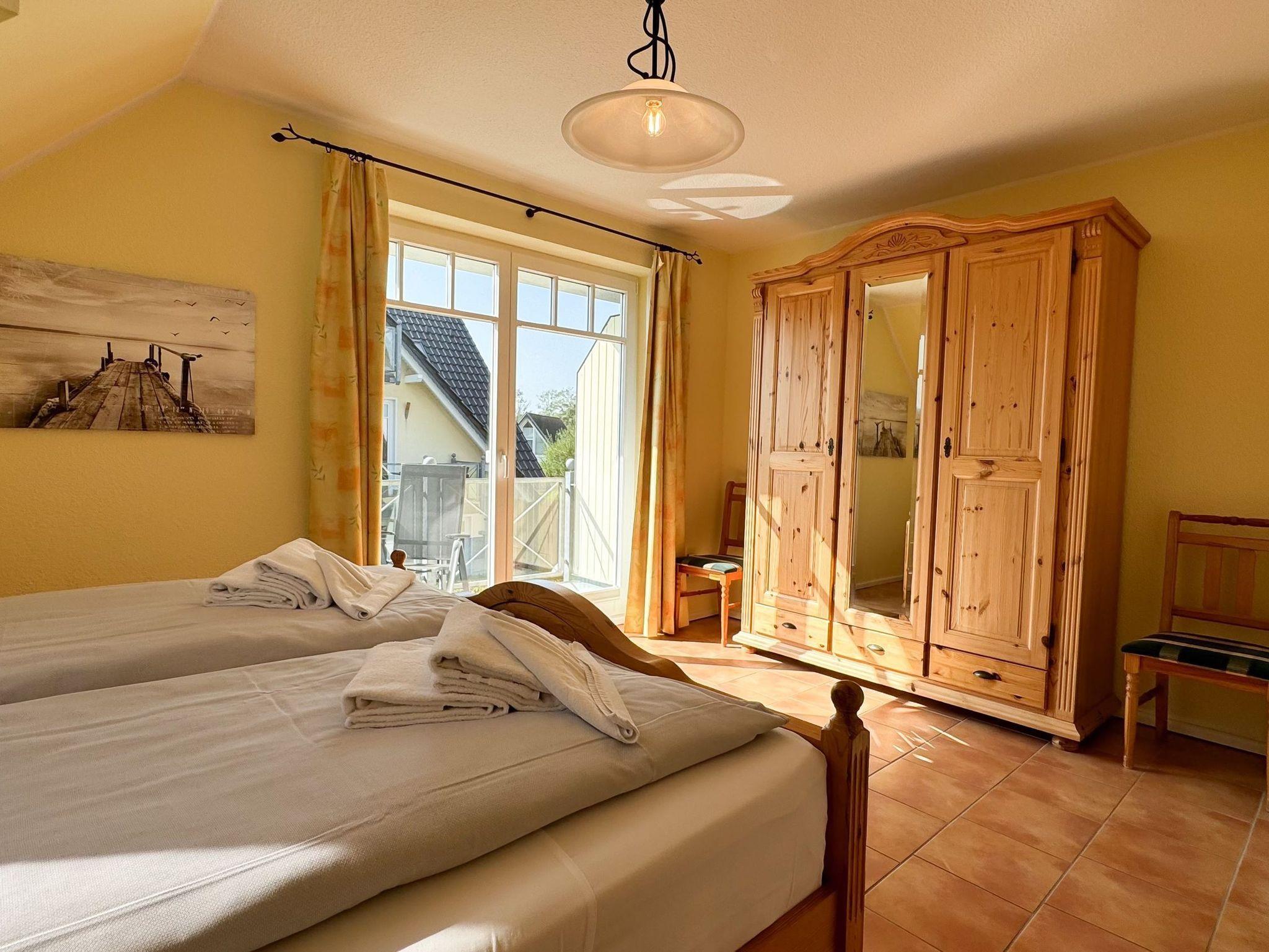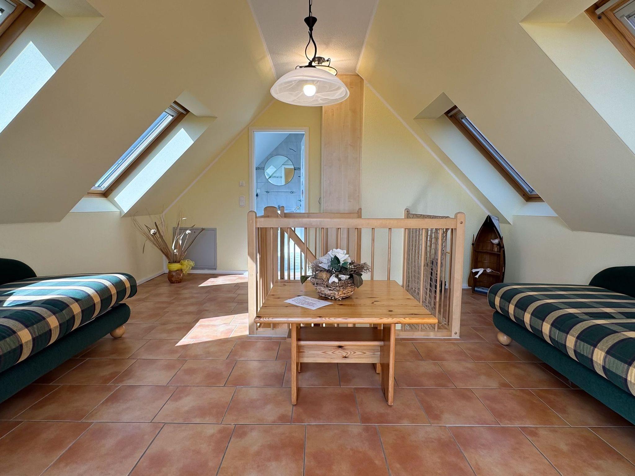 Im Dachgeschoss befinden sich zwei Einzelbetten (Polsterliegen) und ein Bad mit Badewanne. Zur Verfügung stehen drei Balkone und PKW-Stellplatz.