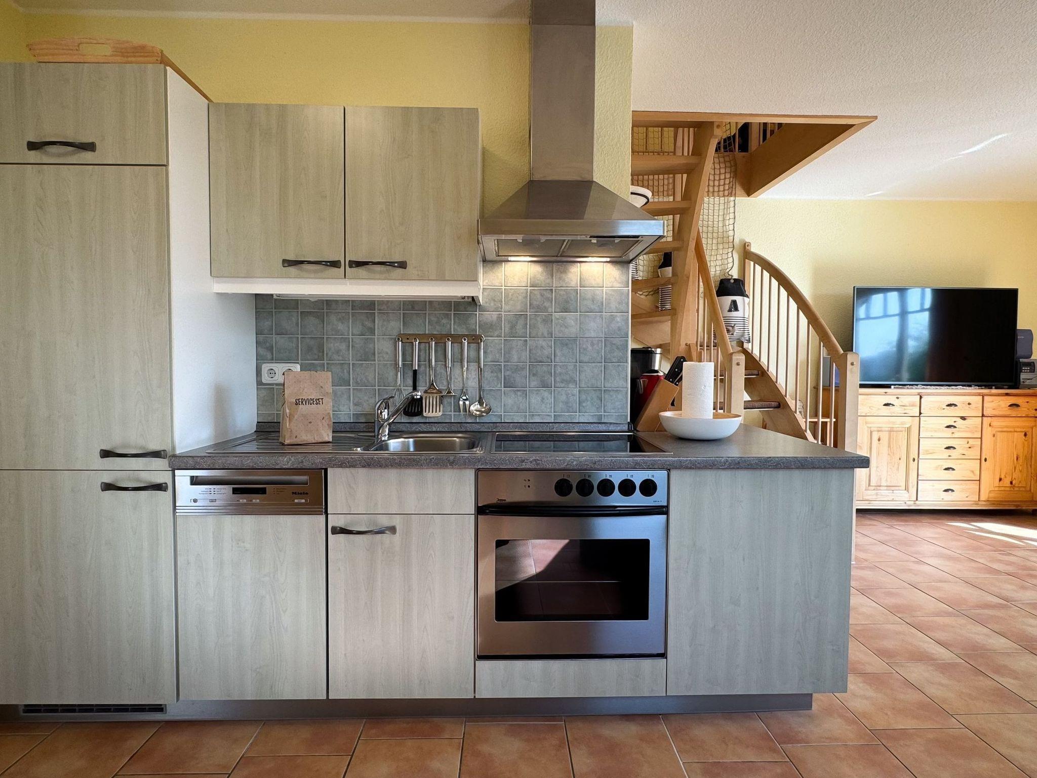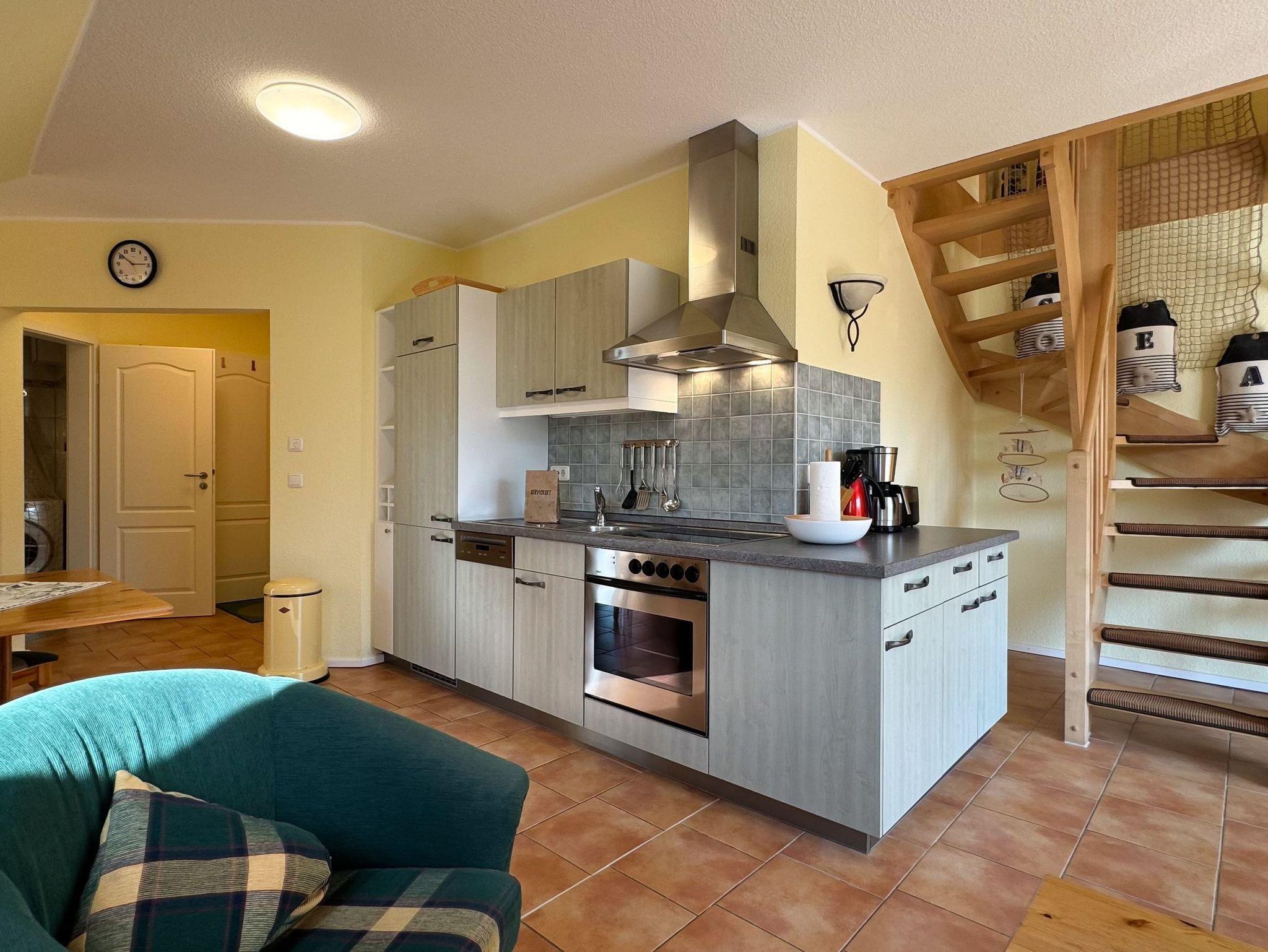 Sie ist komfortabel und hochwertig ausgestattet. Im Obergeschoss befindet sich ein Wohn-/Esszimmer (Polstermöbel, Essplatz, LCD-TV, HiFi-Anlage, W-LAN), eine offene Küchenzeile (komplett mit Ceran-Herd, Kühlschrank, Spülmaschine, div. Küchengeräte) ein Schlafraum mit Doppelbett, sowie ein Bad mit DU/WC.