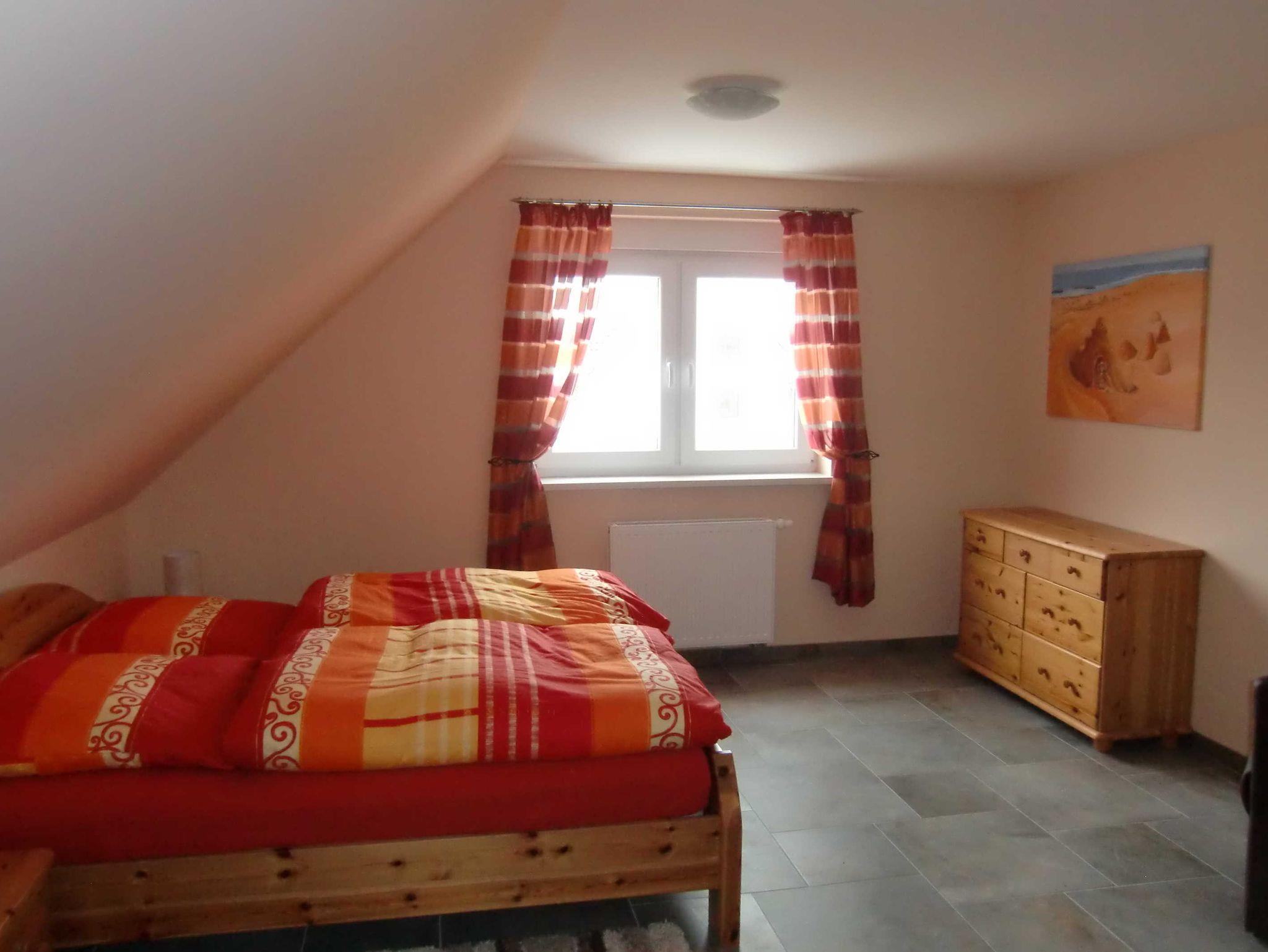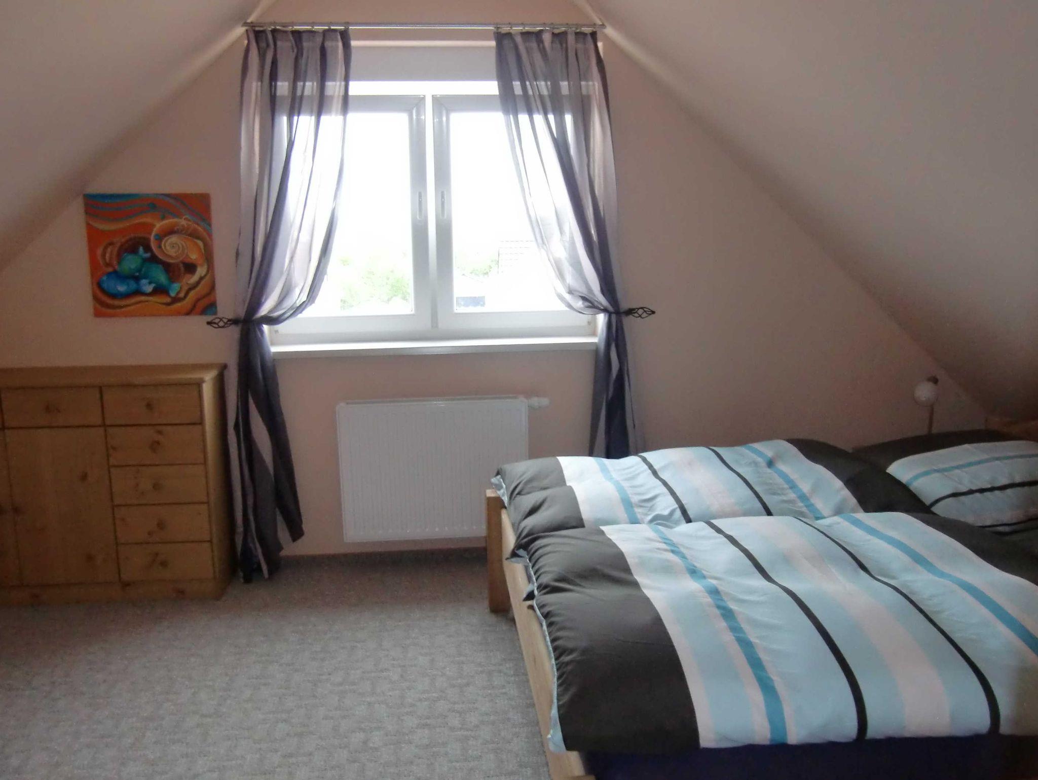 Im Obergeschoss gibt es drei Schlafzimmer und ein zweites Bad mit Badewanne, Dusche und WC. Ein Schlafraum ist mit einem Doppelbett und zwei Einzelbetten ausgestattet, die beiden anderen jeweils mit Doppelbett + Einzelbett oder Liege.