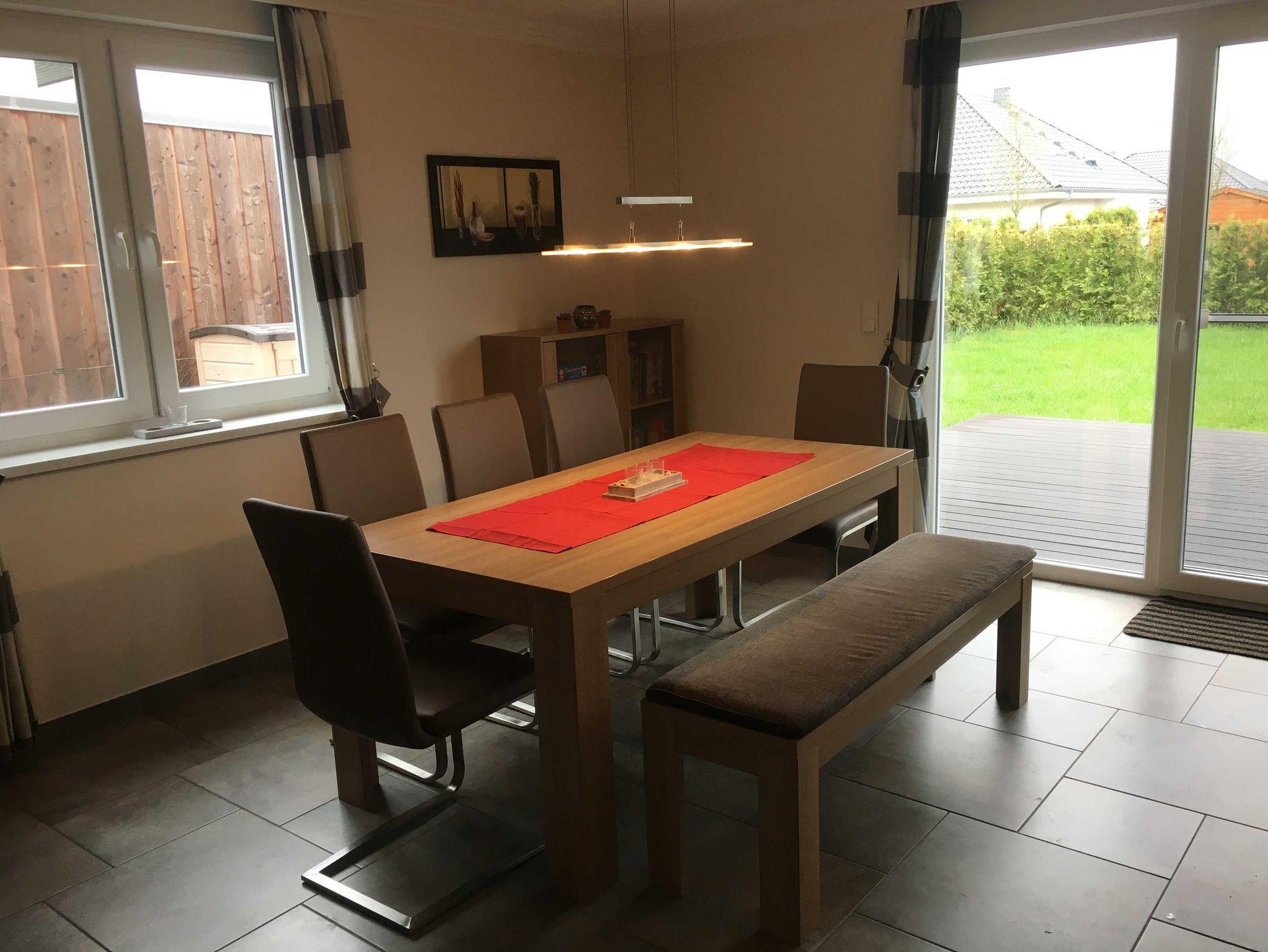Im Erdgeschoss befindet sich der Wohnbereich mit Wohnzimmer und Kaminofen (Kaminholz wird nicht gestellt), offener Küche sowie einem großen Esstisch.