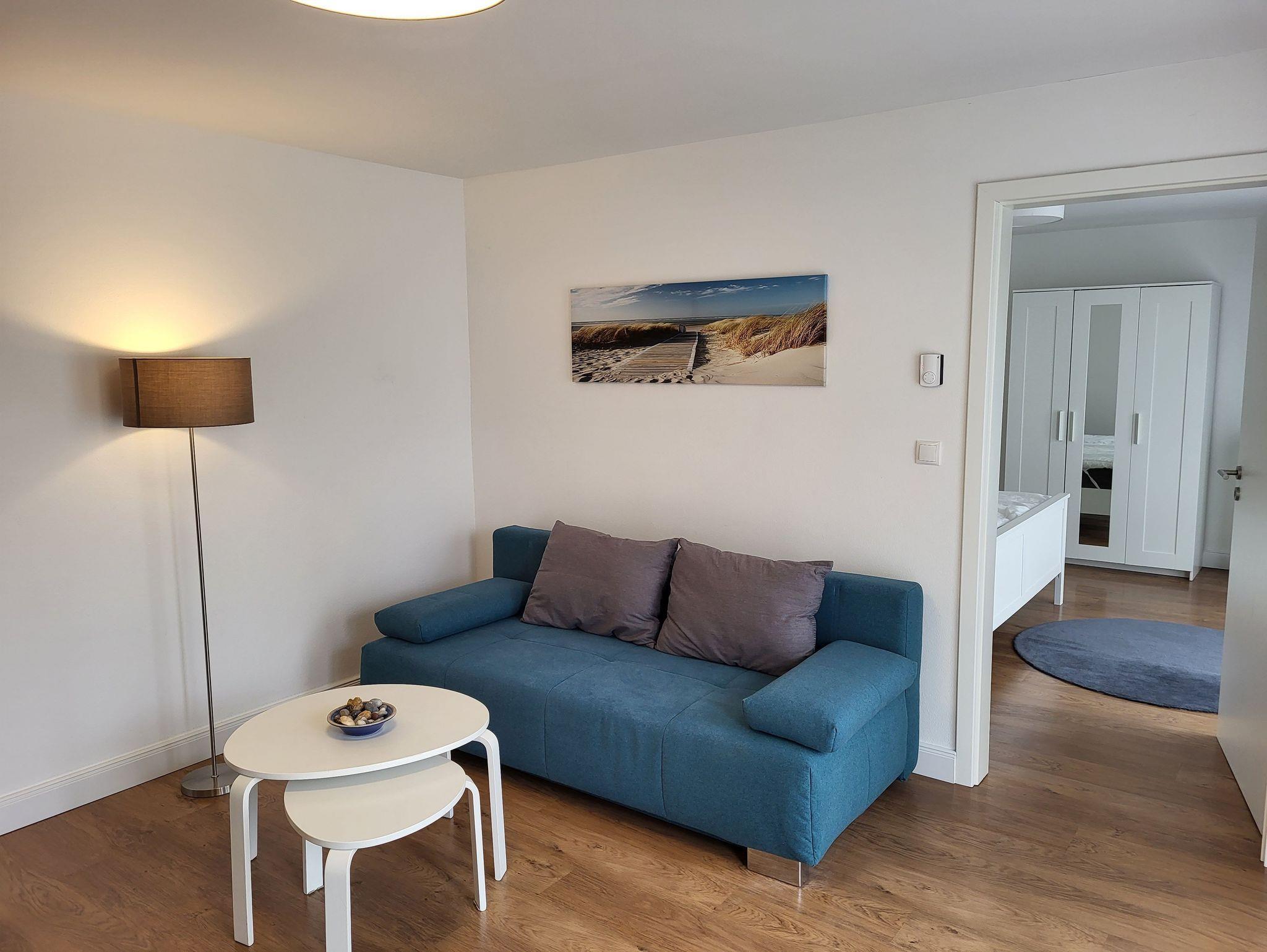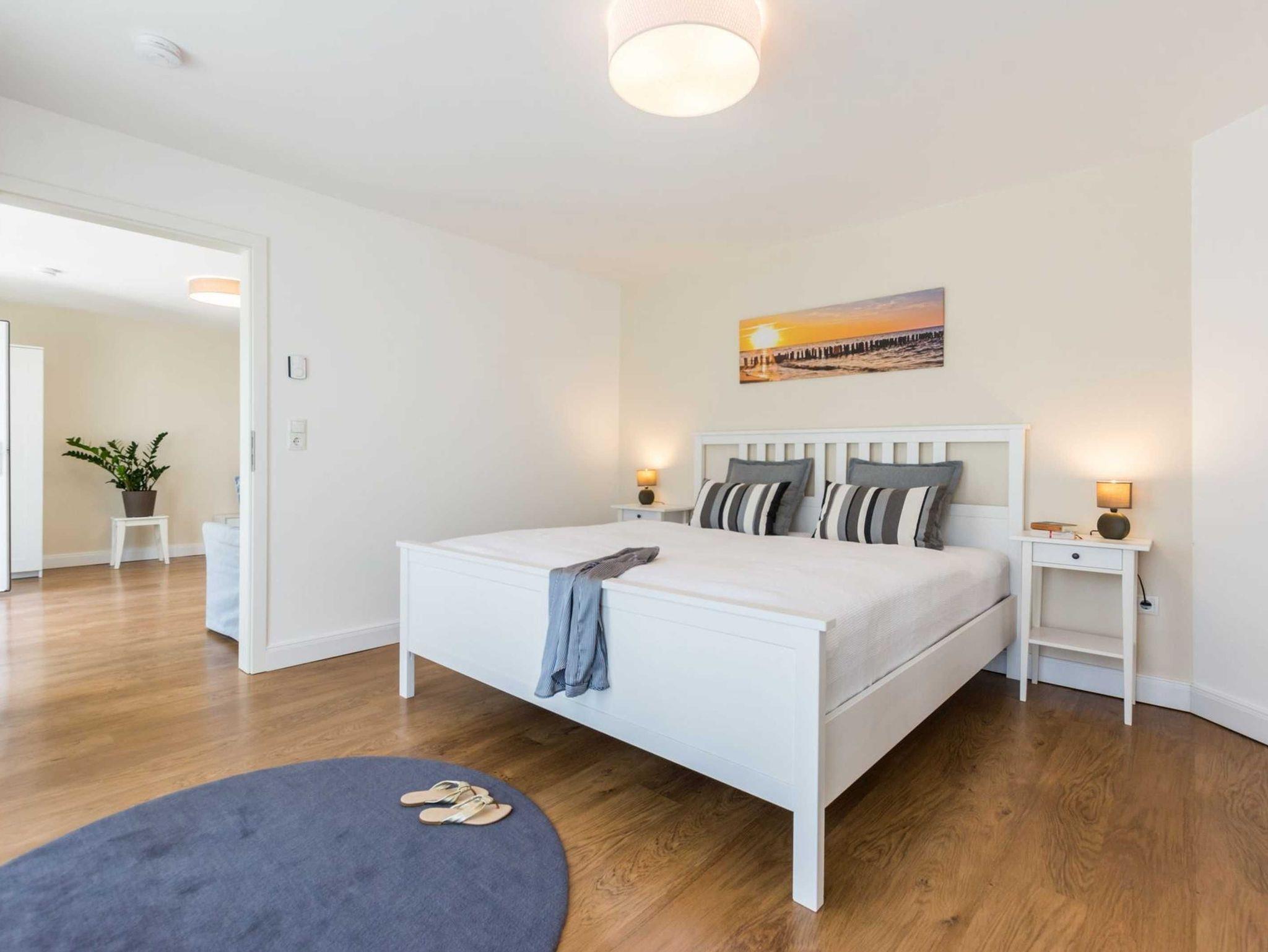 Im Schlafzimmer der Ferienwohnung lädt Sie ein komfortables Doppelbett (2 x 90 x 200 cm) zur Nachtruhe ein. Für zwei weitere Personen wird das Schlafsofa im Wohnbereich mit wenigen Handgriffen zu einem bequemen Schlafplatz (140 x 200 cm). Ein Kleiderschrank und eine Kommode bieten Ihnen ausreichend Stauraum für Ihr Urlaubsgepäck.