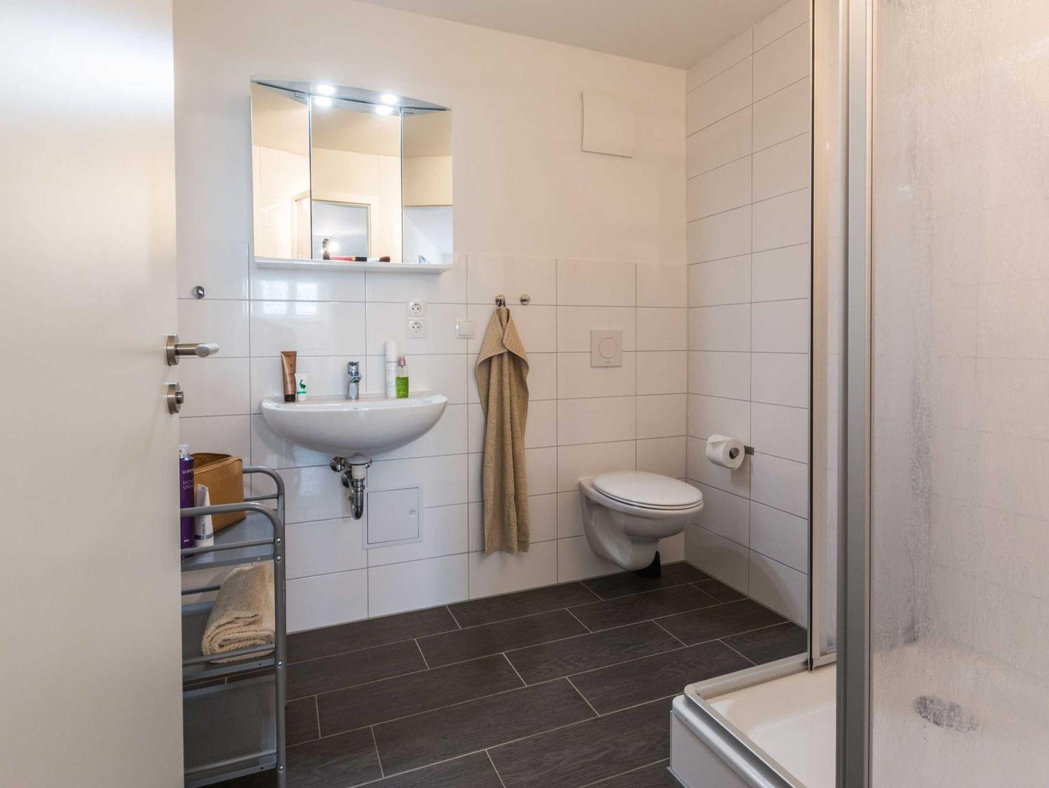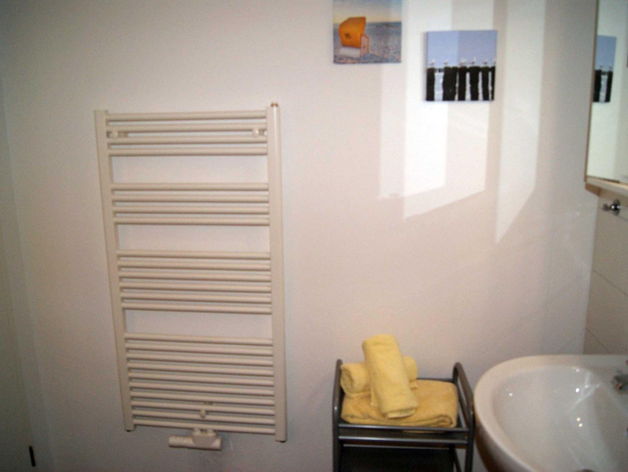 Das Bad verfügt über eine Dusche, ein WC sowie ein Waschbecken. Zum Trocknen und Aufhängen Ihrer Handtücher ist eine Wandheizung vorhanden. Ein Föhn sowie ein Hocker für die kleinen Gäste komplettieren das Bad.