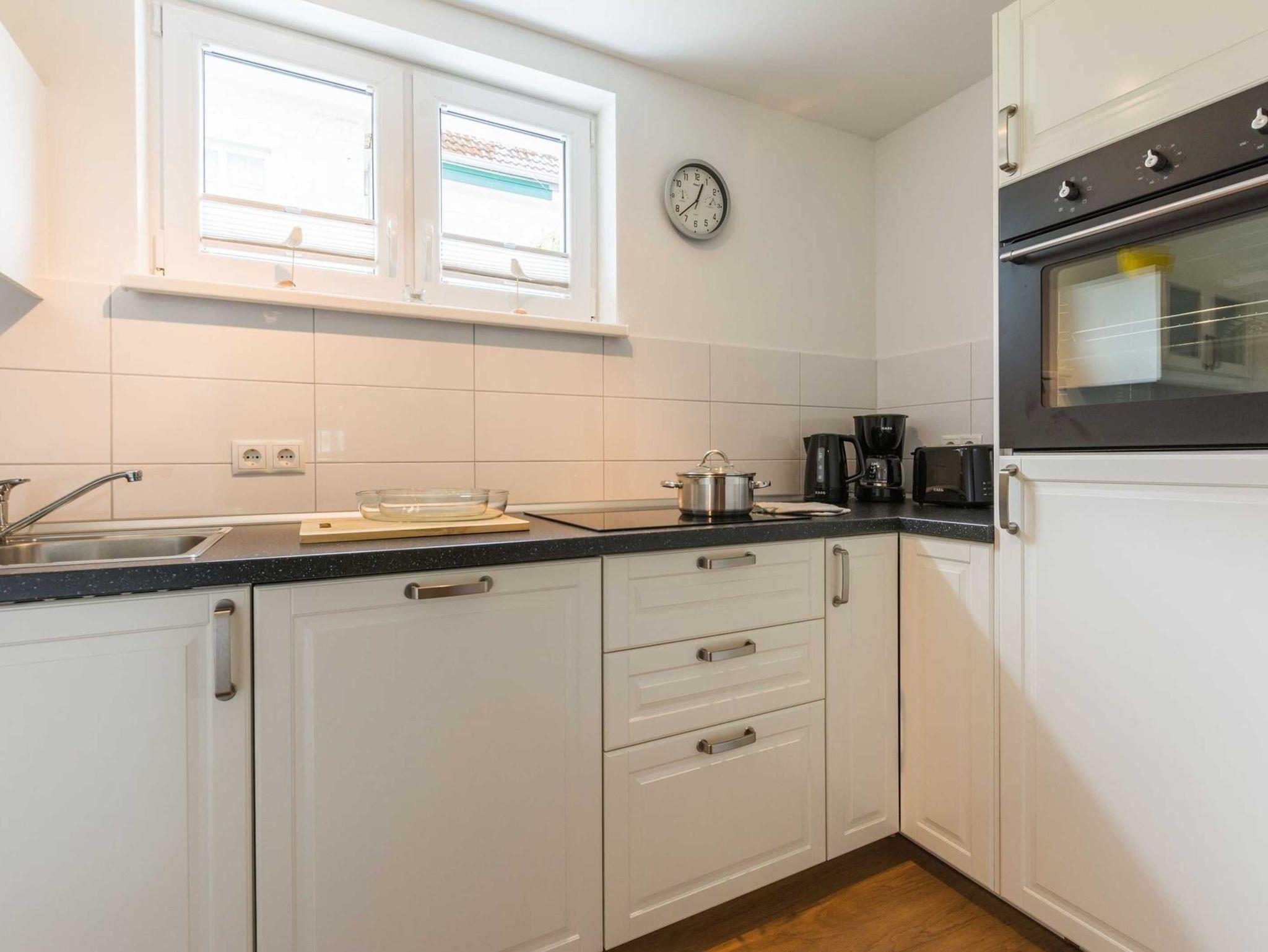 Die Küchenzeile der Ferienwohnung ist für Sie mit einem Backofen, einem 4-Zonen-Cerankochfeld, einem Kühlschrank mit Gefrierfach und einem Geschirrspüler voll ausgestattet. Kleingeräte, wie ein Toaster, eine Kaffeemaschine und ein Wasserkocher, vervollständigen die Kücheneinrichtung.
