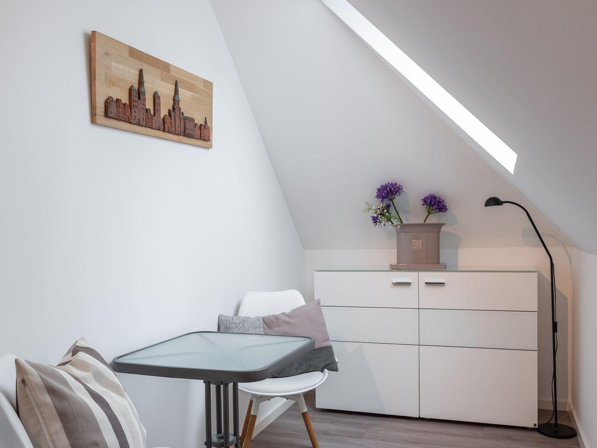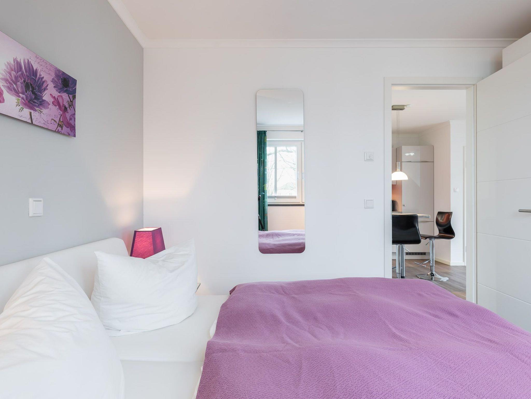 Das hochwertig ausgestattete Schlafzimmer mit Doppelbett, manuell verstellbarem Kopf- und Fußteil, Tonnentaschenfederkernmatratzen, sowie einem Kleiderschrank und Kommode liegt nach Norden.