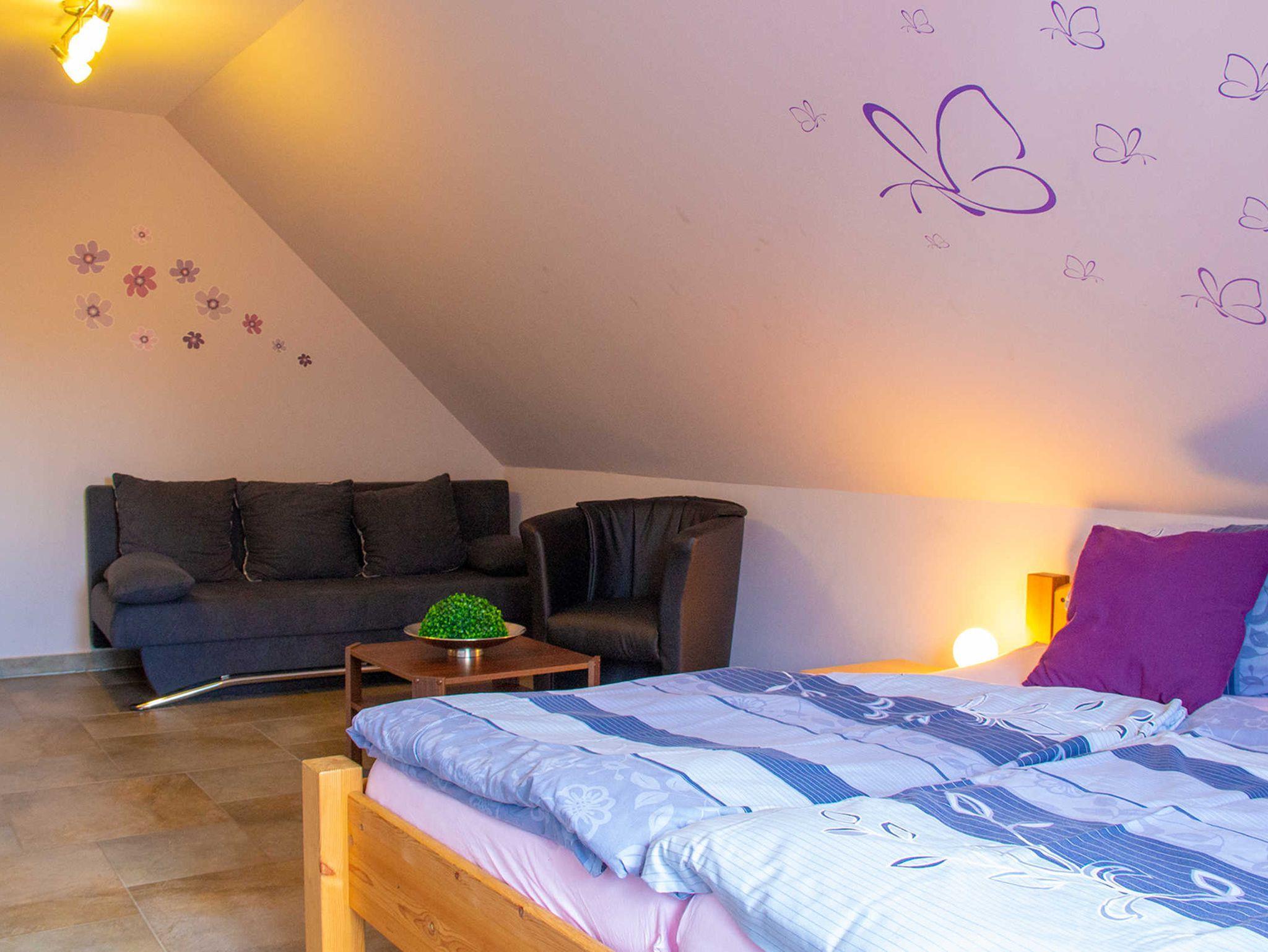 Das Ferienhaus in Nienhagen hat im Obergeschoss drei separate Schlafzimmer und ein Bad mit Dusche, Badewanne und Haartrockner. Im Erdgeschoss gibt es ein Wohnzimmer mit Kamin und angrenzender offener Küche, sowie ein Bad mit Dusche und Sauna. Zusätzlich stehen eine Schlafcouch, ein Kinderreisebett und ein Kinderhochstuhl zur Verfügung.