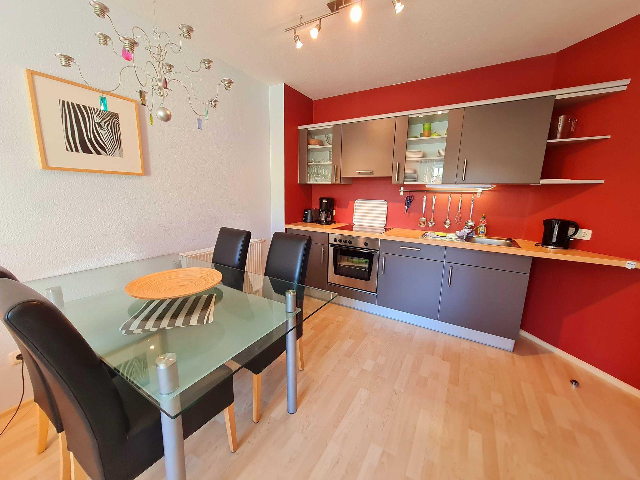 • Küche und Essbereich offen zum Wohnzimmer für 4 Personen, komplett eingerichtete Einbauküche mit Backofen, Ceranfeld, ( ohne Geschirrspüler) Wasserkocher, Toaster, Kaffeemaschine