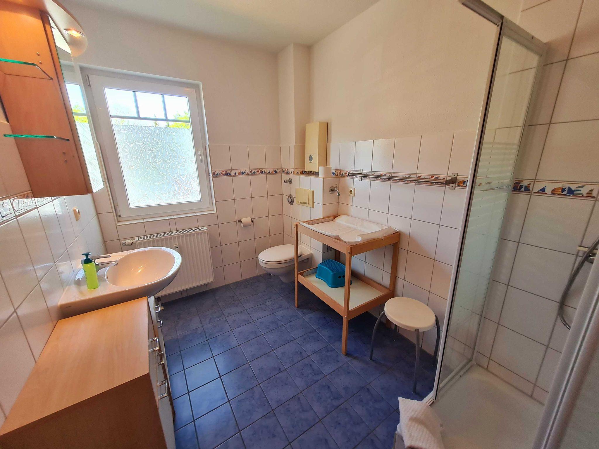 Bad: mit Fenster, Dusche, Waschbecken, Toilette, Spiegelschrank, Unterschrank Waschbecken, Regal, Handtuchhalter, Tritt für Kinder, Wickeltisch