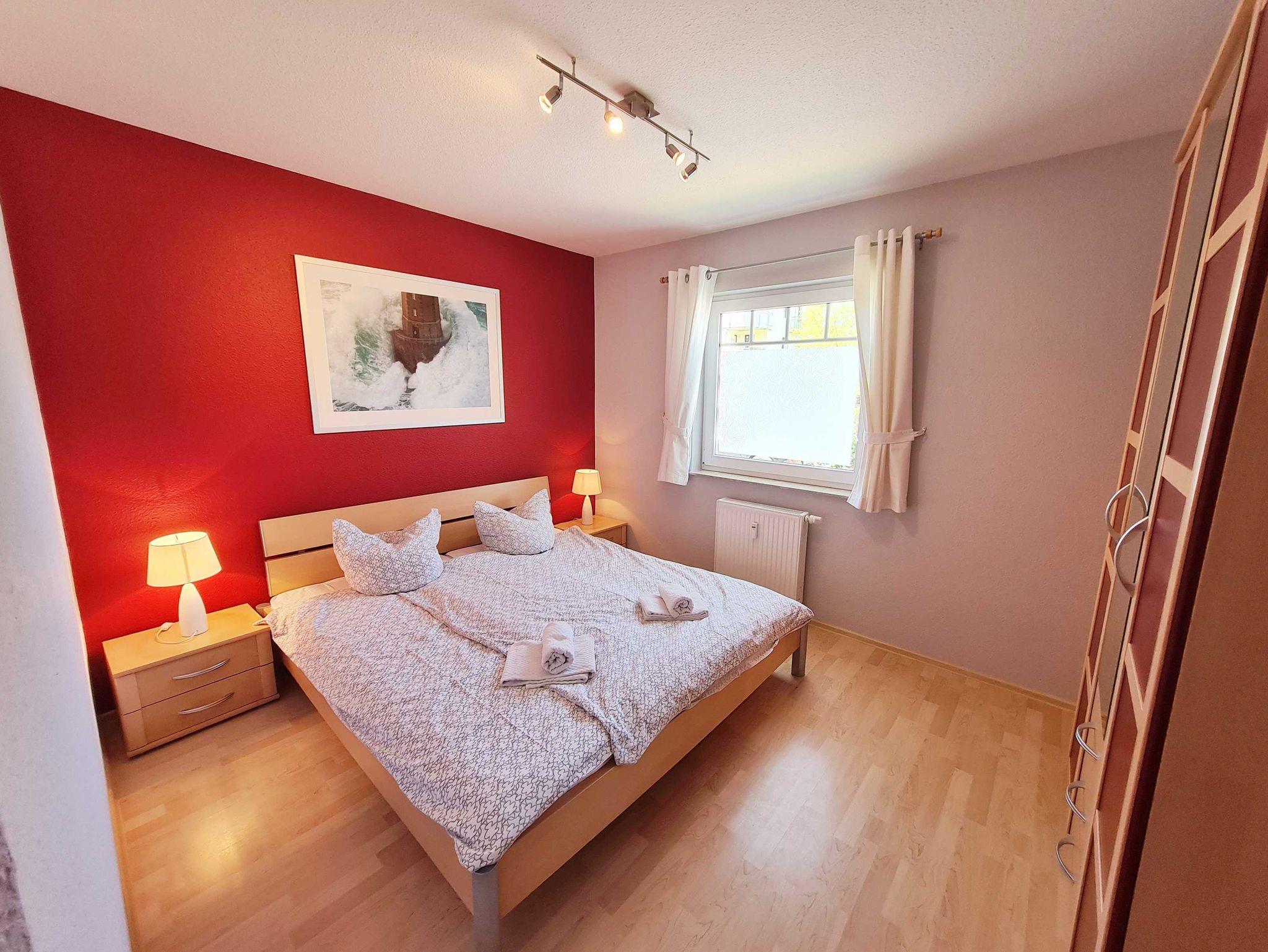 • Schlafzimmer : Doppelbett mit zwei Einzelmatratzen 90x200 cm, Schrank, Nachttische, Lampen, Plissee, Fliegengitter