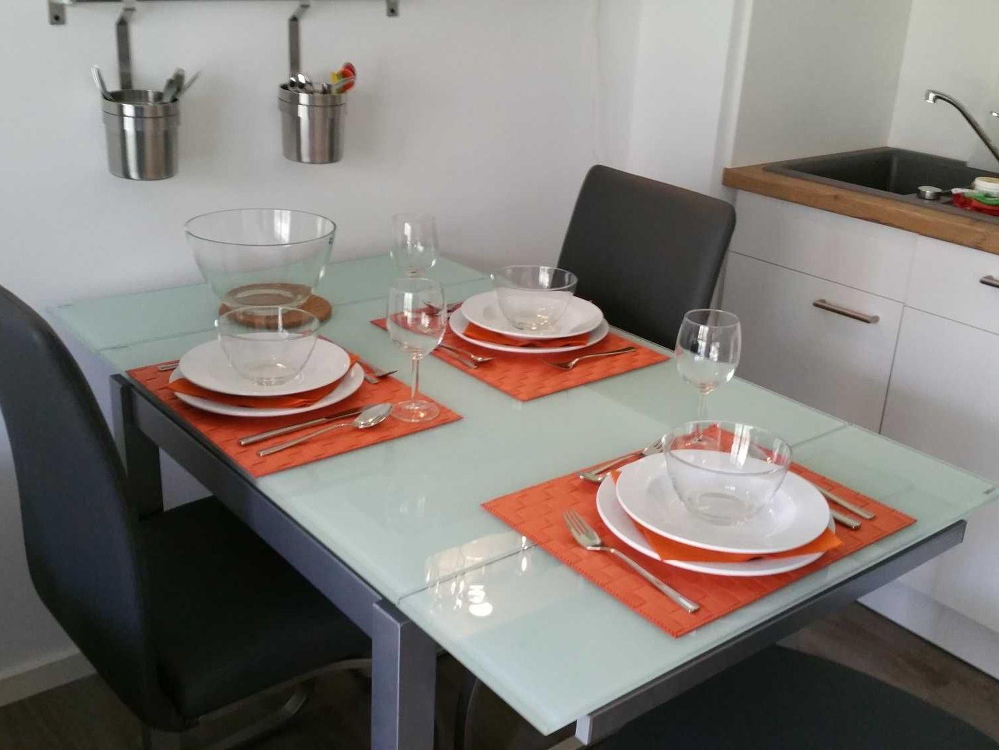 Im offenen Ess- und Küchenbereich finden Sie einen Tisch mit vier Stühlen und eine moderne Einbauküche mit einem Zwei-Feld-Ceranfeld, Geschirrspüler, Kühlschrank mit Gefrierfach, Backofen mit Mikrowellenfunktion, Kaffeemaschine, Wasserkocher und Toaster.