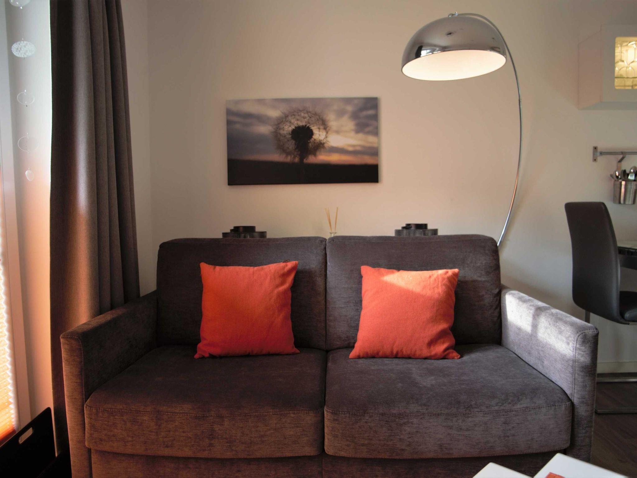 Diese für drei Personen ausgestattete Wohnung befindet sich im Erdgeschoss des Hauses Pamir. Vom Wohnbereich haben Sie Zugang zur geschützten Terrasse, von der Sie direkt auf die umzäunte Grünanlage mit altem Baumbestand gelangen. Auf der Couch, die sich zum Bett (140 x 200 cm) umfunktionieren lässt, lässt sich wunderbar relaxen. Flatscreen-TV, Blue Ray-Player und eine kleine Stereoanlage gehören zur Ausstattung.