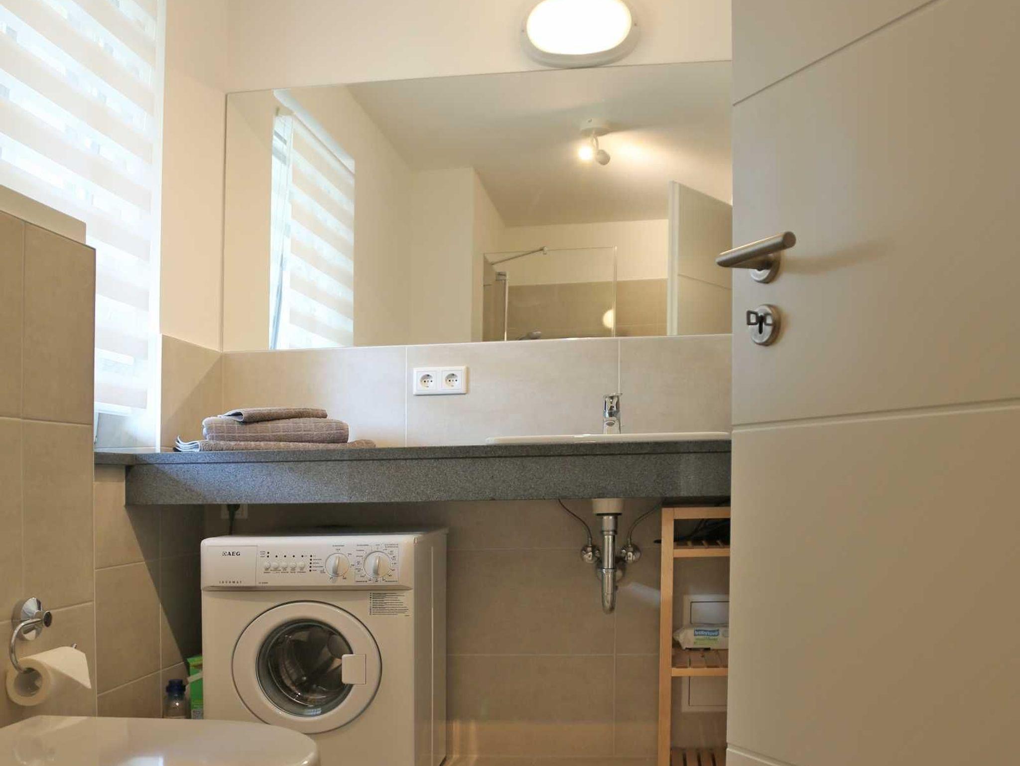 Das neben dem Kinderschlafzimmer liegende Bad verfügt neben den sanitären Anlagen (ebenerdige Dusche, Waschtisch, WC) über einen Haartrockner und eine kleine Waschmaschine, die Sie kostenlos nutzen können.