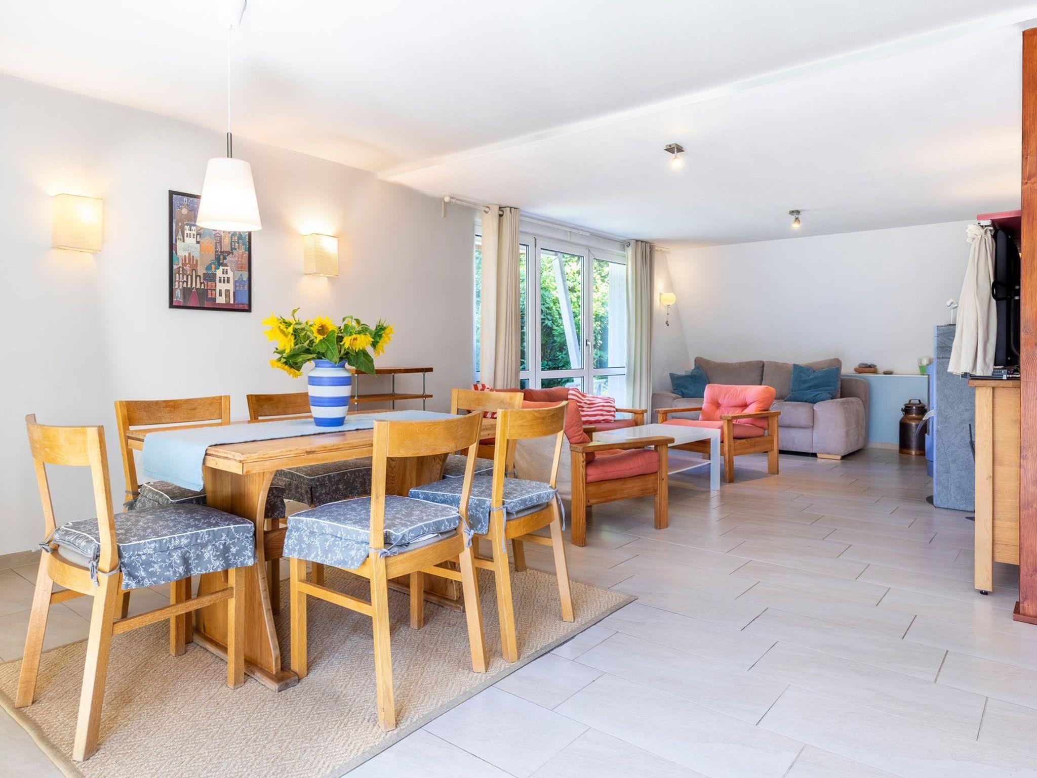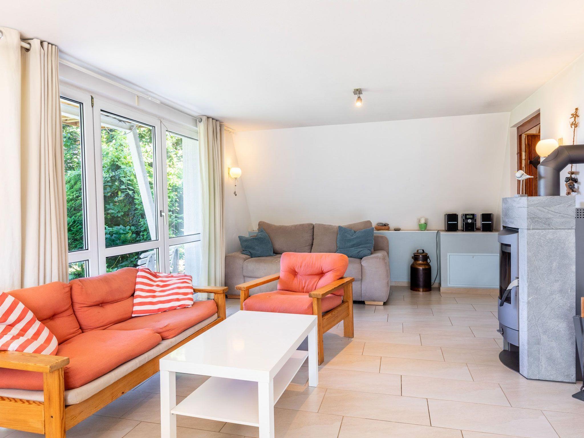 • Erdgeschoss: Grosses Wohnzimmer mit Essbereich mit Gartenblick und Terrassenzugang, Eßtisch, Sitzecke (Schlafcouch 1,60m x 2m im Erdgeschoß) mit Kaminofen und Flachbild- TV, Fussbodenheizung. Küchenzeile (Kühlschrank/ Gefrierfach, Induktionskochfeld (4 Kochfelder), Mikrowellenofen mit Grill/ Heissluft, Geschirrspüler. Duschbad/ WC (4,5m²).