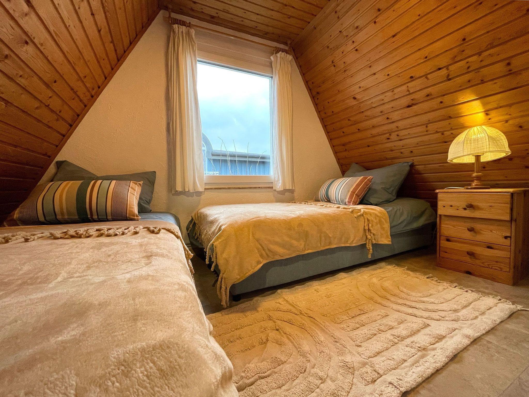 3- Raum- Finnhütte mit Kaminofen, über 2 Ebenen (Erd- und Dachgeschoß), Schlafcouch und Duschbad im Erdgeschoss, 2 Schlafzimmer im Dachgeschoss, grosszügiger Wohn- und Küchenbereich mit Zugang zur Gartenterrasse. Duschbad/ WC. 2 Terrassen: Seeseite (Norden) und Sonnenseite (Südwesten).
