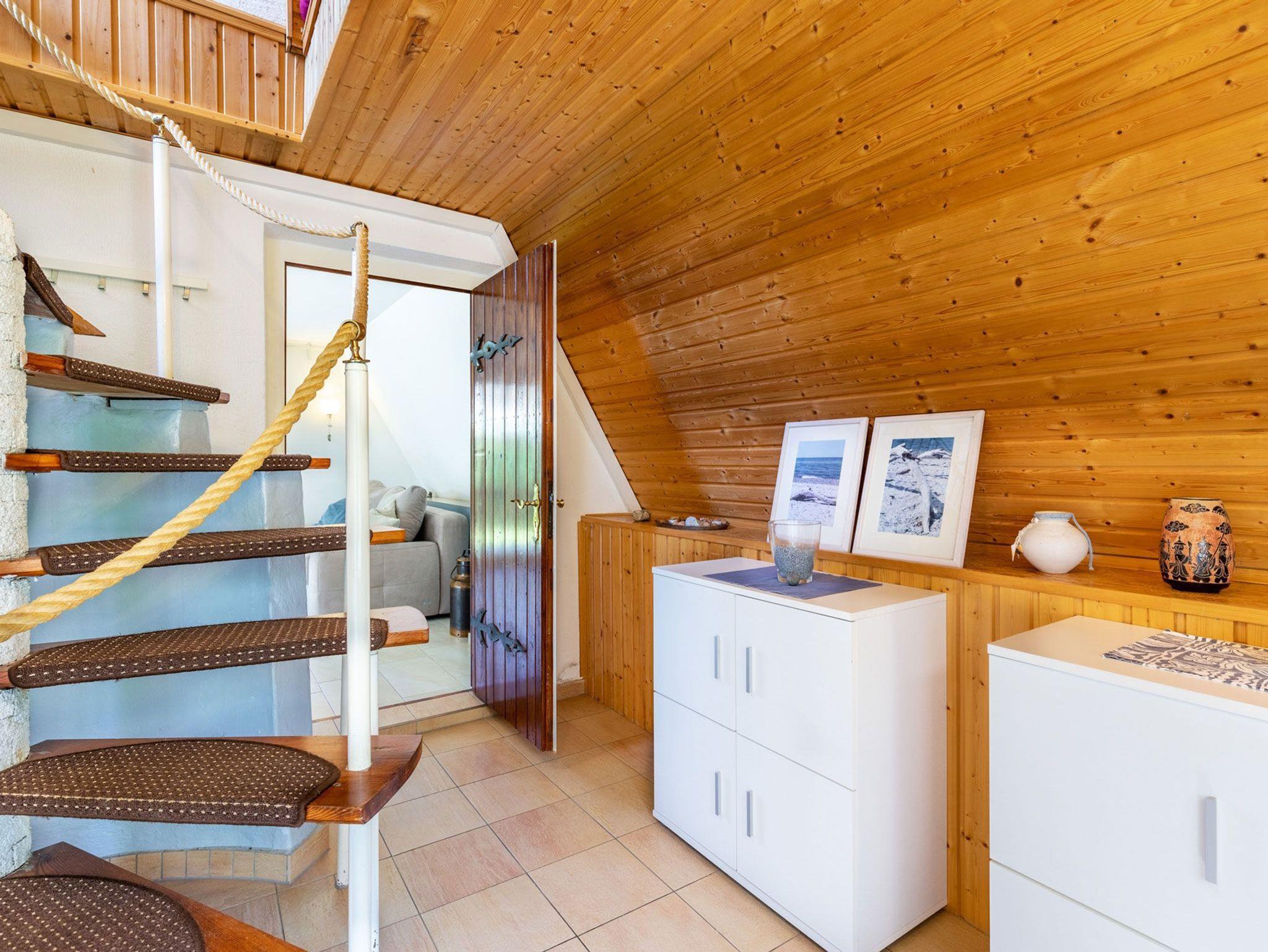 • 2 kleine Schlafzimmer mit Heizkörper unter Dachschrägen: 1 kleines Kinderzimmer (2 Einzelliegen), 1 Schlafzimmer (Doppelbett 1,80m x 2m + Einzelliege 0,90m x 2m), Babybett stellbar. Balkon mit Meerblick.
