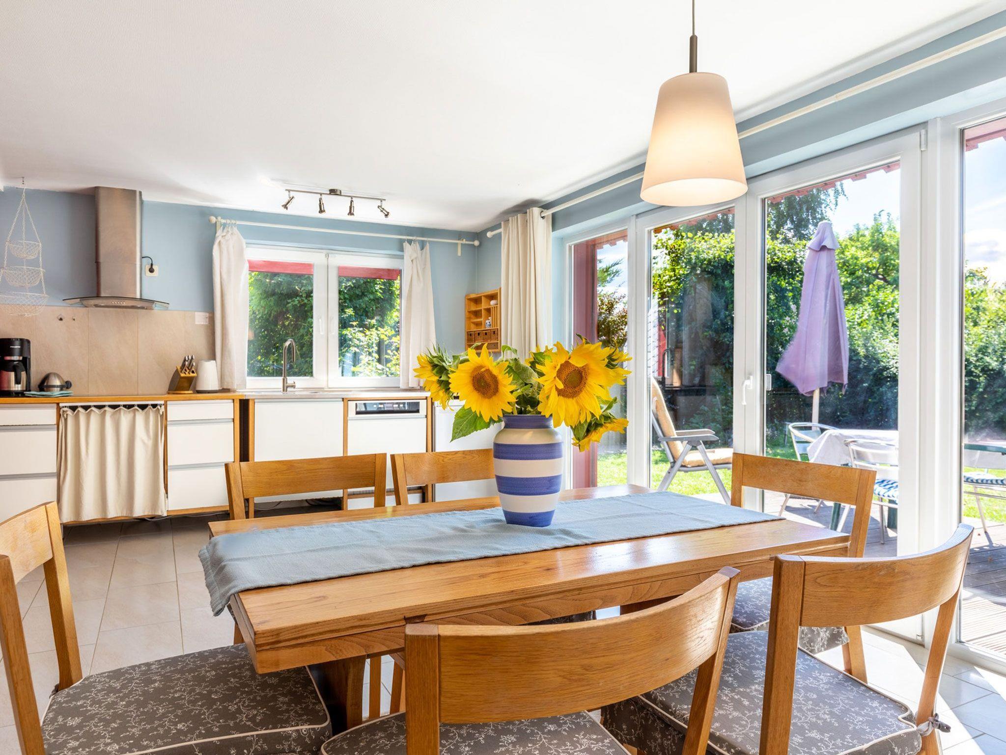 Grosse Terrasse mit Gartenmöbeln und Grill. Garten 500m², schön ruhige Lage am Ortsrand von Ostseebad Nienhagen.