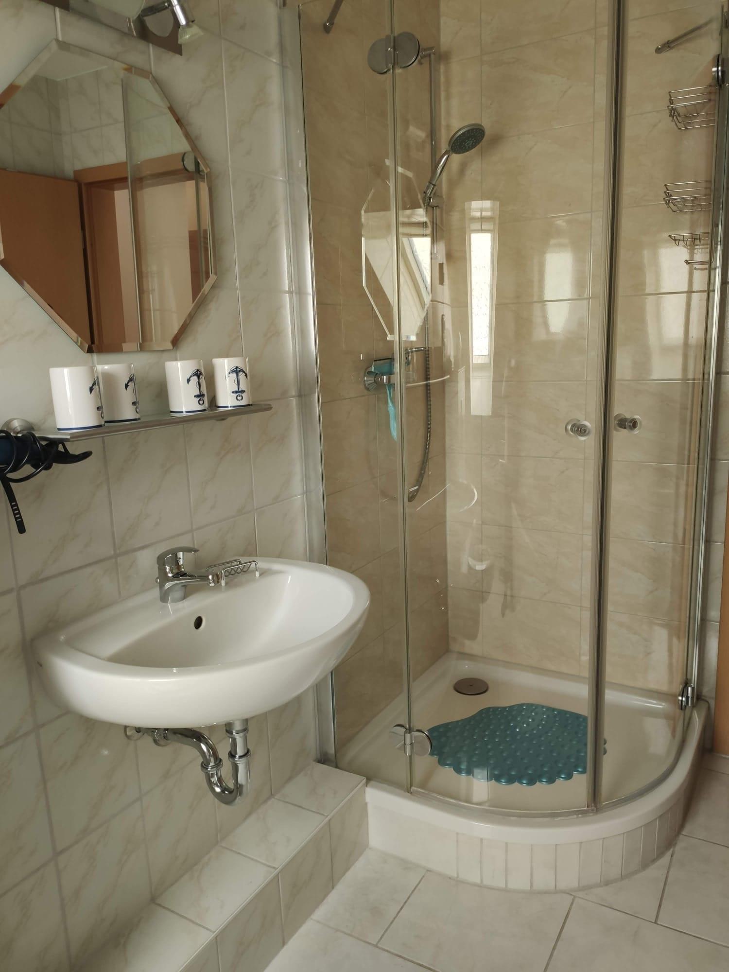 Ihr gefliestes TAGESLICHTBADEZIMMER ist sowohl mit einer Badewanne als auch mit einer verglasten Dusche ausgestattet. Waschbecken, Spiegel, Haartrockner und Ablagefläche sorgen für weiteren Komfort.