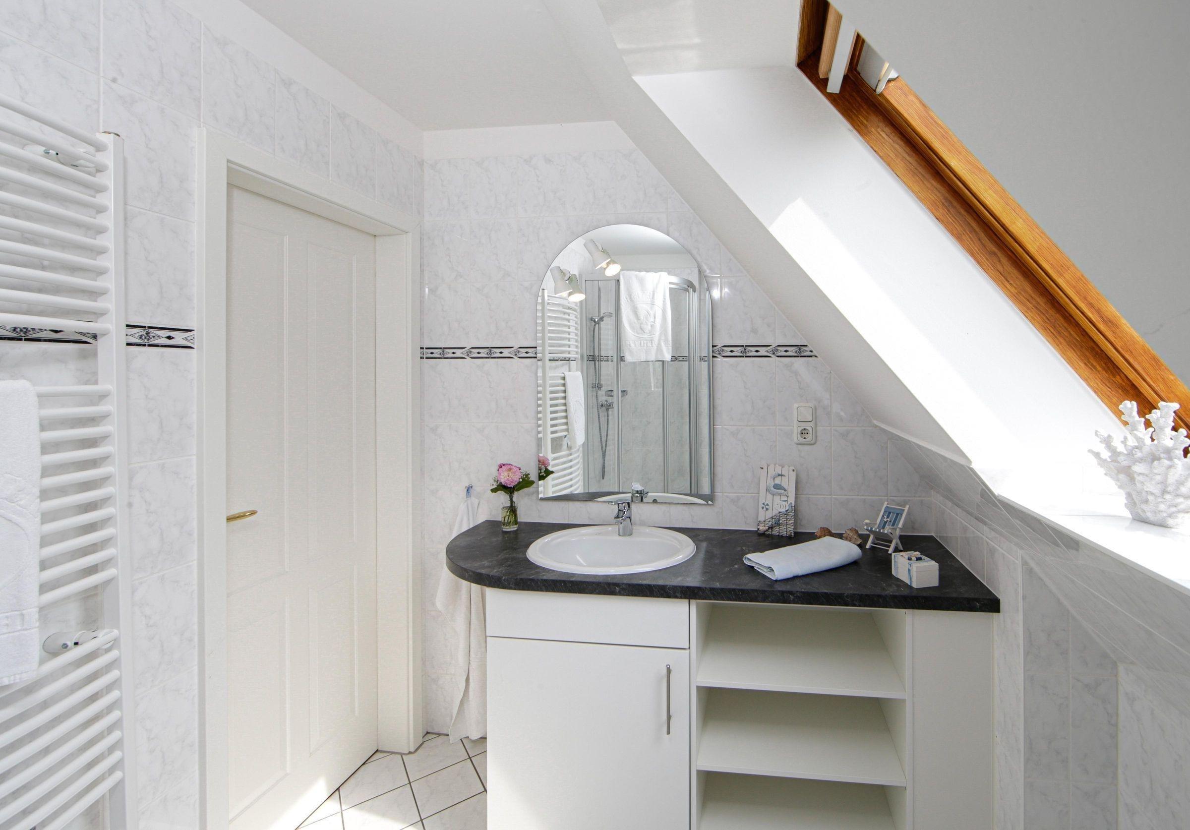 Das moderne Badezimmer ist mit einer Dusche, einem Waschbecken mit Unterschrank, einem Handtuchheizkörper sowie einem WC ausgestattet.