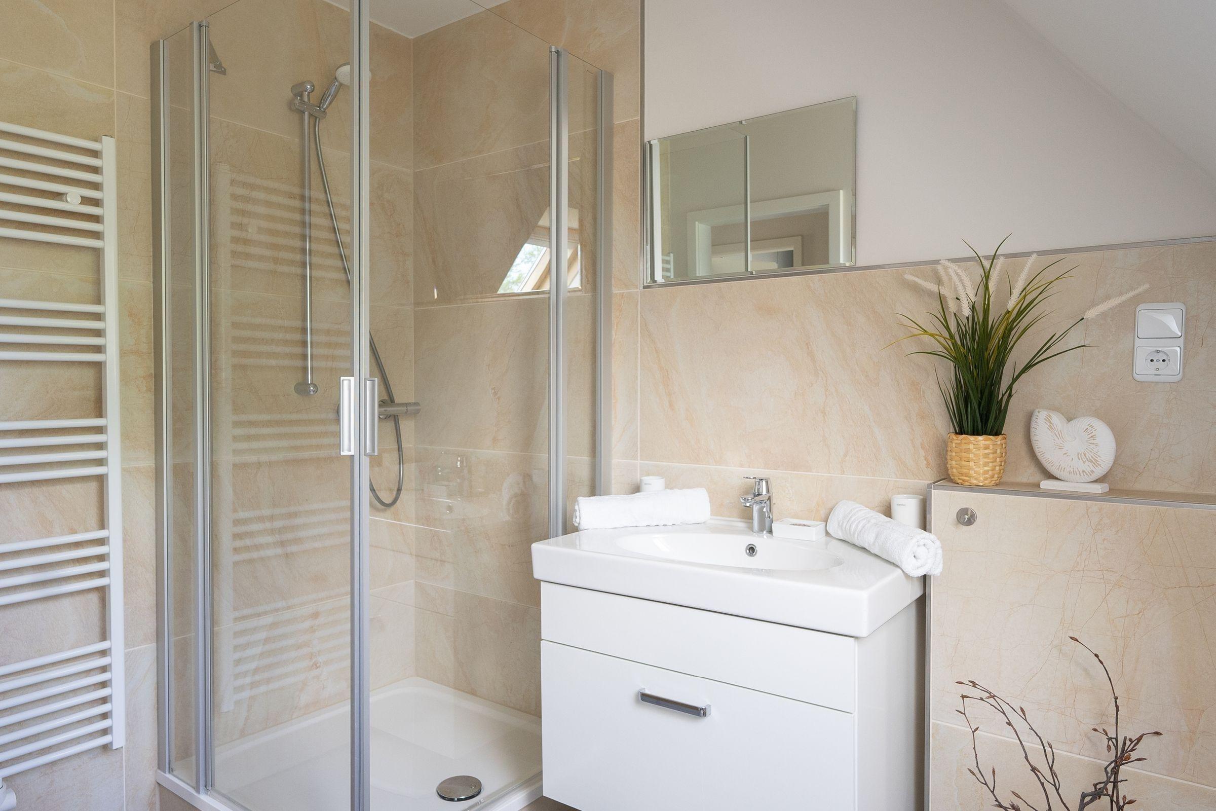 Das exklusive Badezimmer ist eingerichtet mit einer Dusche, einem WC, einem Waschbecken mit Unterschrank sowie einem Handtuchheizkörper. Ihre Badutensilien finden ausreichend Platz auf den vorhandenen Ablageflächen.