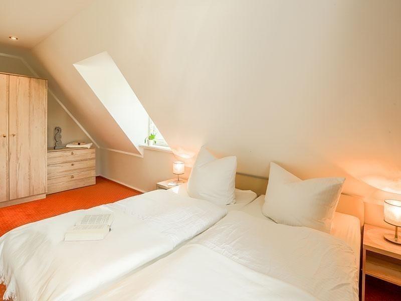 Über eine Wendeltreppe gelangen Sie in das Obergeschoss. Hier befinden sich 2 Schlafzimmer, wobei eines mit einem zusätzlichen Fernseher und einem komfortablen Doppelbett, das zweite mit zwei Einzelbetten ausgestattet ist.