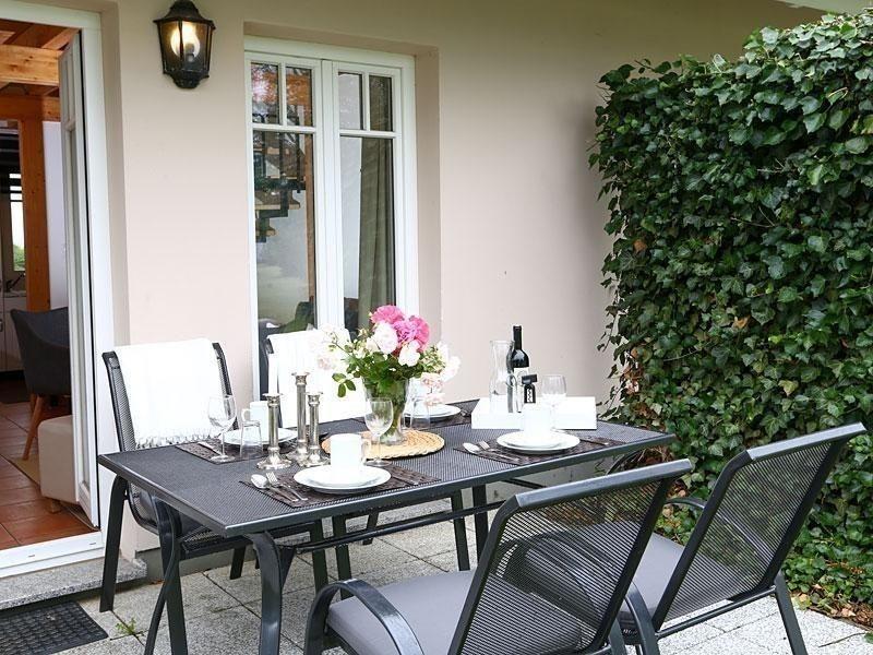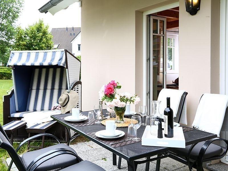 Genießen Sie unbeschwerte Stunden auf der charmanten Terrasse, die vom Wohnzimmer aus begehbar ist. Von hier aus haben Sie einen freien Blick auf die nahe Umgebung sowie die weitläufigen, gepflegten Rasenflächen, die die Terrasse umsäumen. Moderne Gartenmöbel und ein hübscher Strandkorb zum gemütlichen Verweilen mit der ganzen Familie runden das maritime Ambiente ab.