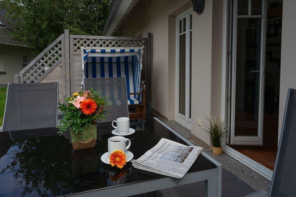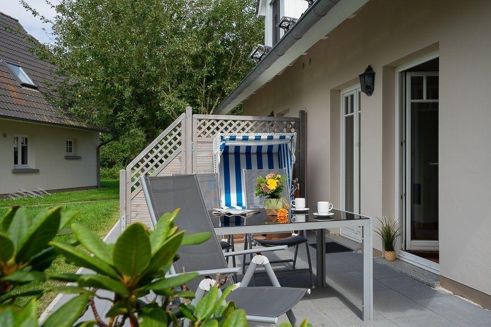 Vom Wohnzimmer gelangen Sie auf die charmant anmutende Terrasse, von hier aus haben Sie einen einzigartigen Ausblick auf die Ruhe ausstrahlende Umgebung und die weitläufigen, sehr gepflegten Grünflächen. Komfortable Gartenmöbel und ein hübscher Strandkorb vervollständigen die harmonische Atmosphäre im Außenbereich des Hauses.