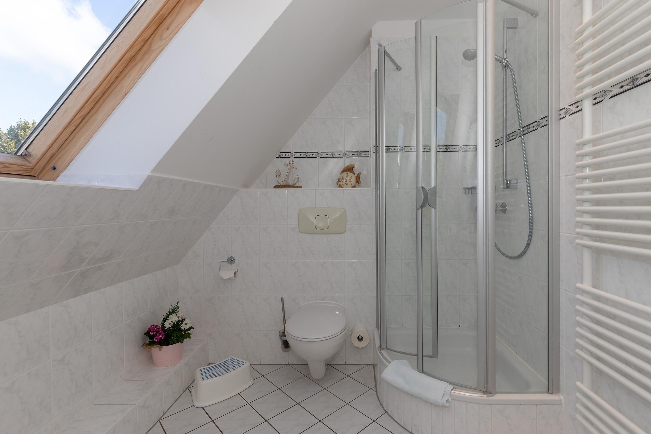 Das moderne Badezimmer verfügt über eine Dusche, ein WC, ein Waschbecken mit geräumigem Unterschrank, einen Handtuchheizkörper sowie ausreichend Ablageflächen für Ihre Badutensilien.