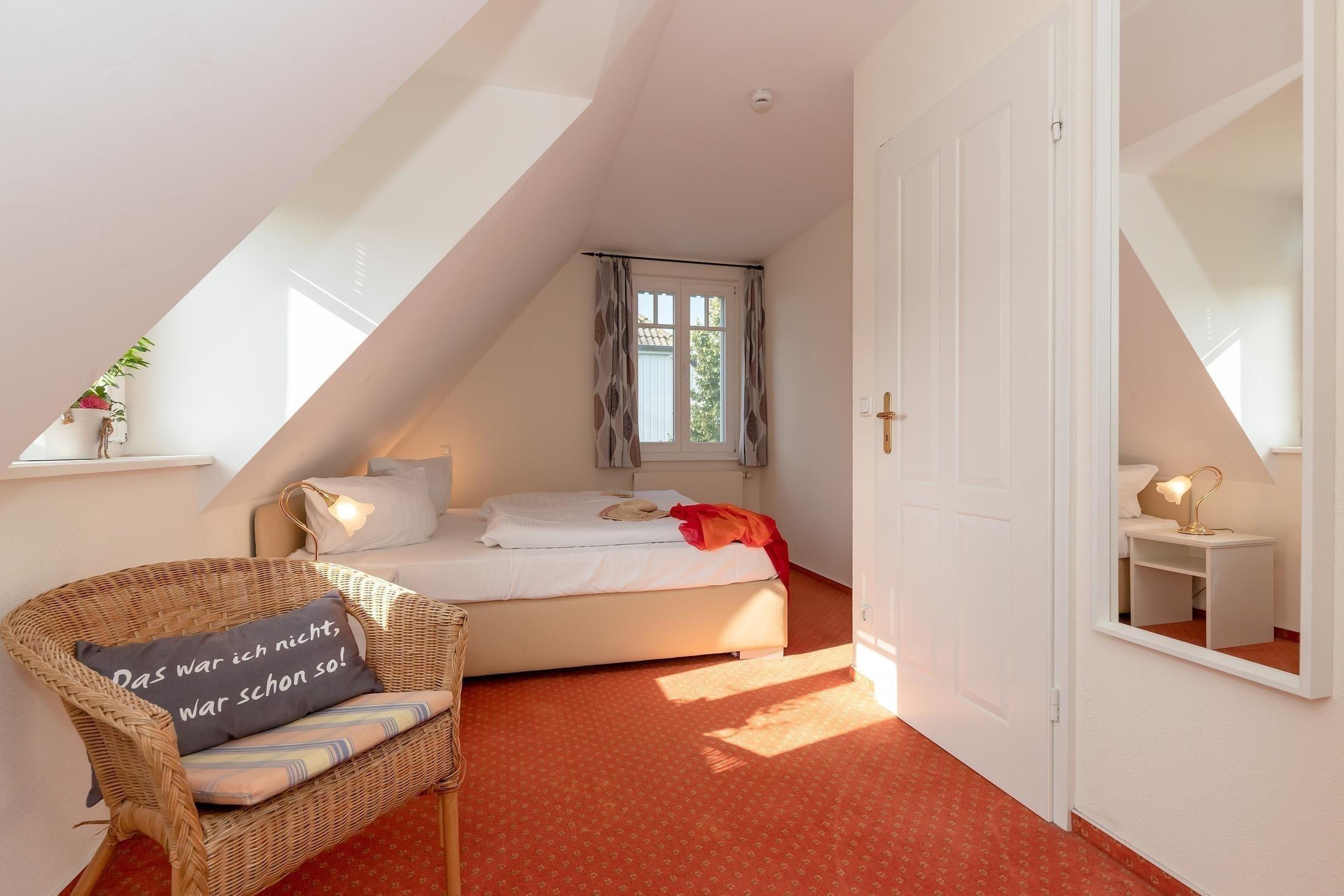 In das Obergeschoss gelangen Sie über eine Wendeltreppe. Hier befinden sich zwei Schlafzimmer, jeweils mit einem Doppelbett, einem Kleiderschrank sowie Kommoden ausgestattet.