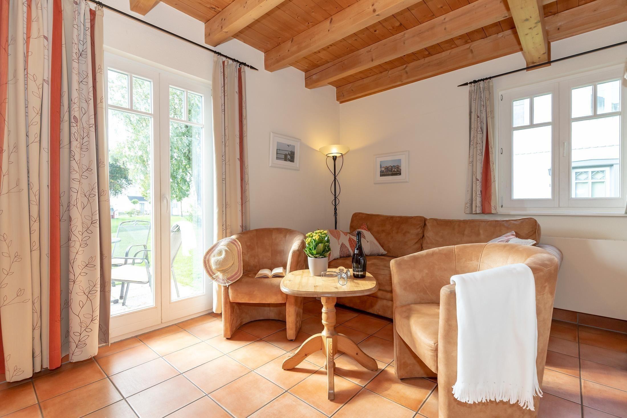 Freuen Sie sich auf entspannte Stunden im geschmackvoll möblierten Wohnbereich im Erdgeschoss. Zwei bequeme Sessel und eine komfortable Sofa-Garnitur laden zu einem gemütlichen Beisammensein mit der Familie ein. Die Sofa-Garnitur ist mit wenigen Handgriffen ausziehbar und bietet somit 2 Personen eine Schlafmöglichkeit für die Nacht.