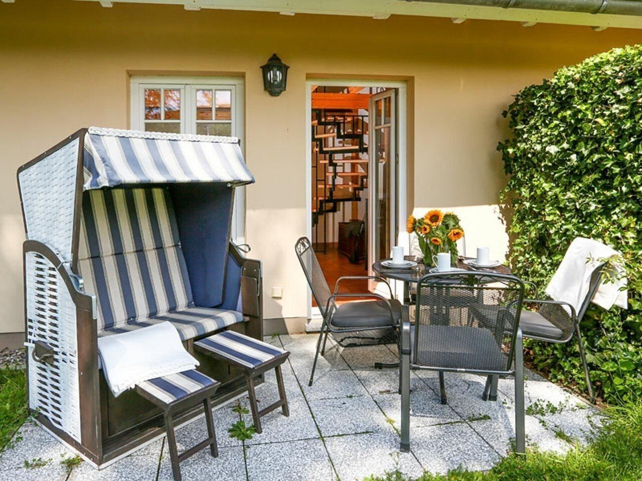 Für ein Highlight im Außenbereich des Hauses sorgt die bezaubernde Terrasse. Genießen Sie von hier die Ruhe ausstrahlende Umgebung mit Blick auf weitläufige, gepflegte Grünflächen, die die Terrasse umfassen. Moderne und bequeme Gartenmöbel laden zum Verweilen ein, und ein hübscher Strandkorb vervollständigt an diesem Ort die harmonische Atmosphäre.