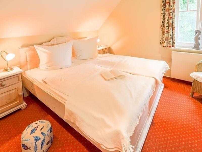 Eine Wendeltreppe führt ins Obergeschoss, wo sich zwei Schlafzimmer, jeweils mit einem komfortablen Doppelbett sowie einem geräumigen Kleiderschrank eingerichtet, befinden.