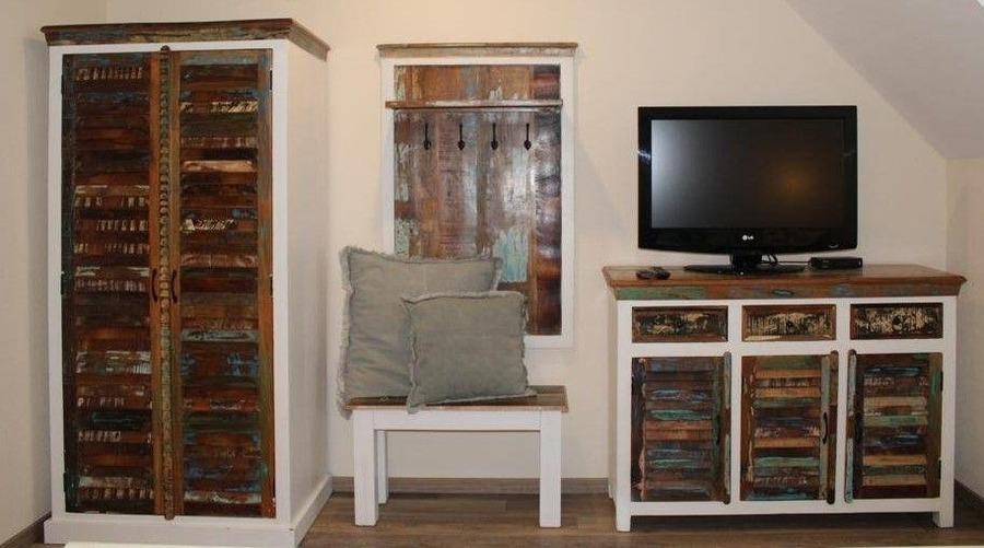 In das Obergeschoss gelangen Sie über eine Wendeltreppe. Hier befinden sich die beiden Schlafzimmer. Eines ist mit einem komfortablen Doppelbett sowie einem zusätzlichen Fernsehgerät, das zweite mit zwei Einzelbetten ausgestattet. Beide Schlafzimmer verfügen über je einen geräumigen Kleiderschrank für Ihre gesamte Urlaubsgarderobe.