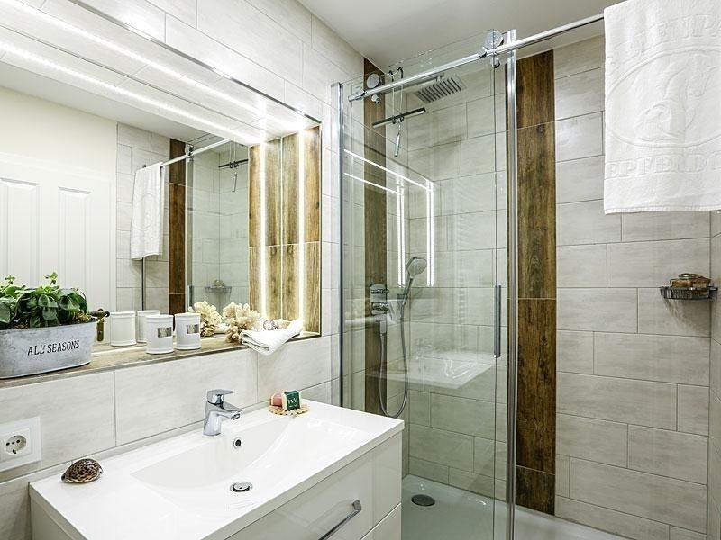 Das Badezimmer, ebenfalls auf dieser Ebene gelegen, verfügt über eine Dusche, ein WC, ein Waschbecken mit Unterschrank sowie einen Handtuchheizkörper. Für Ihre Bad-Utensilien sind ausreichend Ablageflächen vorhanden.