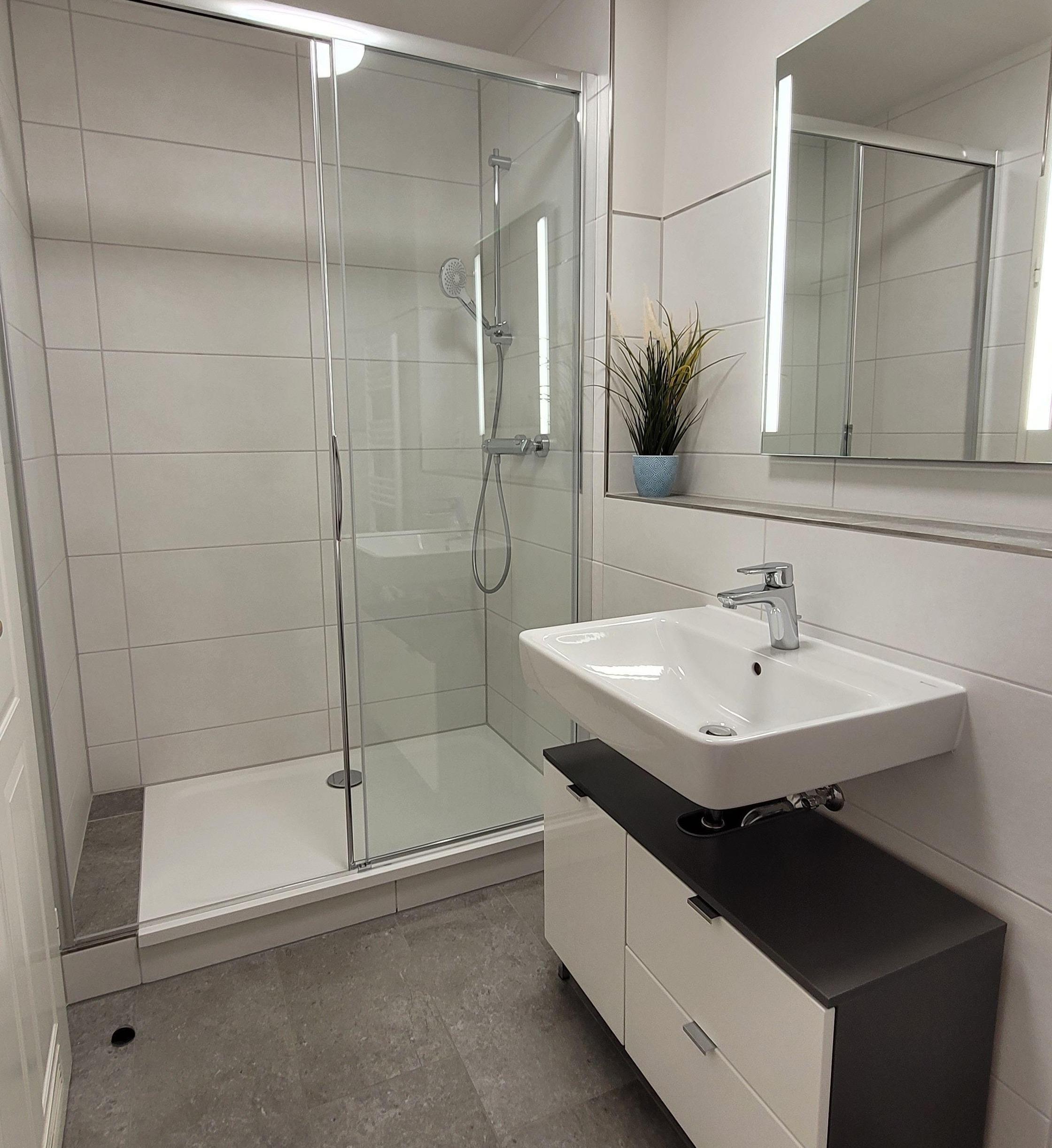 Auf dieser Ebene befindet sich ebenso das innen liegende Badezimmer, das mit einer Dusche, einem WC, einem Waschbecken sowie Ablageflächen für Ihre Badutensilien ausgestattet ist.