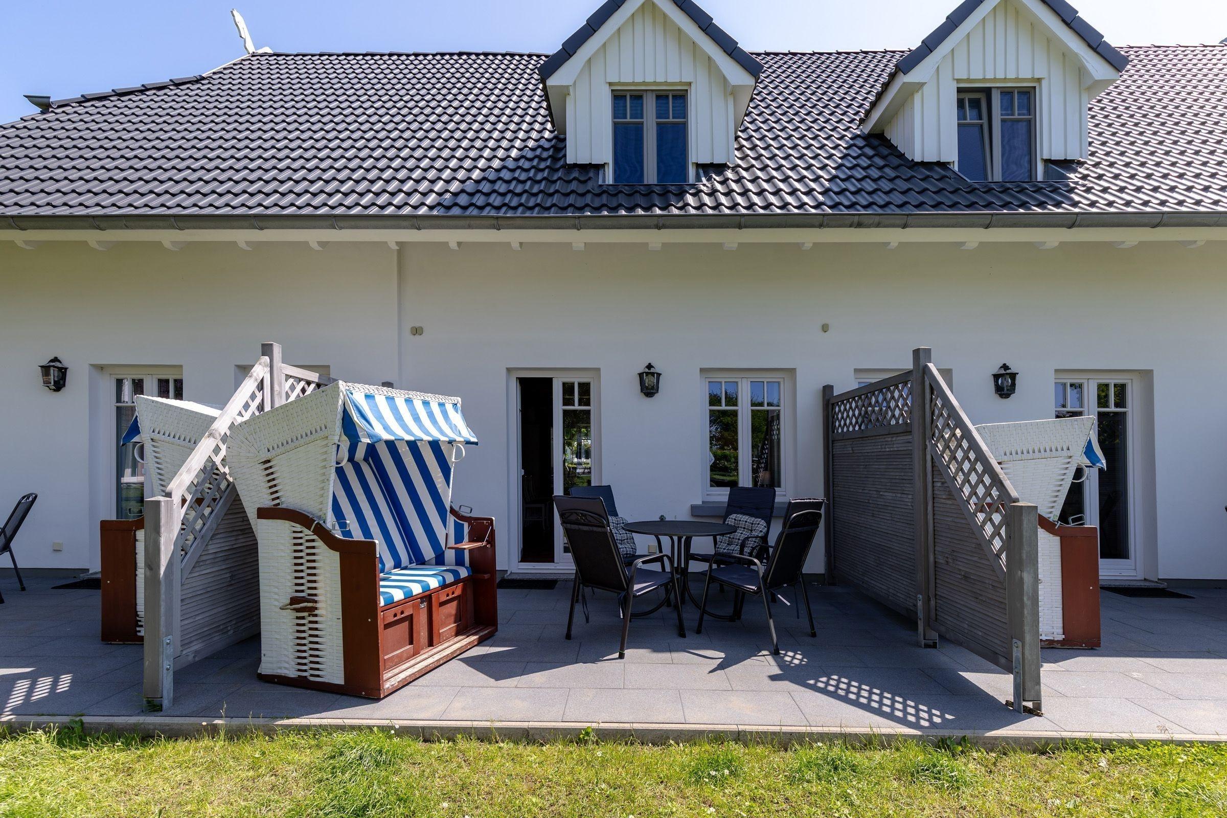 Vom Wohnbereich gelangen Sie auf die romantische Terrasse. Hier können Sie sich auf den bequemen Gartenmöbeln niederlassen und Ihren Ostseeurlaub genießen. Für ein besonderes maritimes Flair sorgt ein hübscher Strandkorb. Von hier haben Sie einen freien Blick auf die Ruhe ausstrahlende Umgebung mit weitläufigen, sehr gepflegten Rasenflächen. Einfach traumhaft!