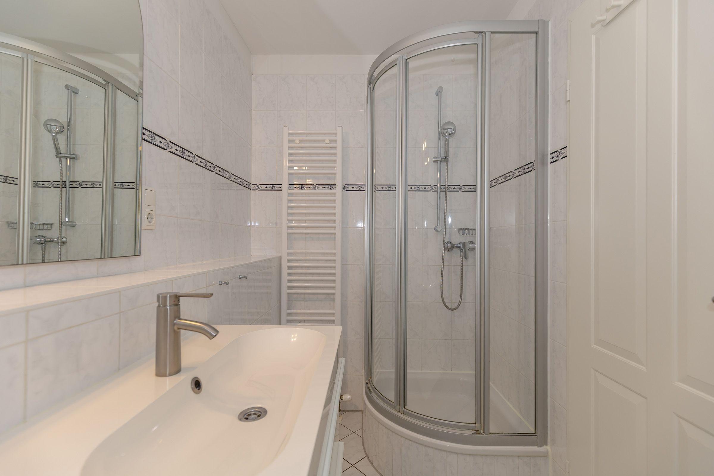 Das Badezimmer verfügt über eine Dusche, ein WC, ein Waschbecken mit Unterschrank sowie Ablageflächen für Ihre Kosmetikartikel.