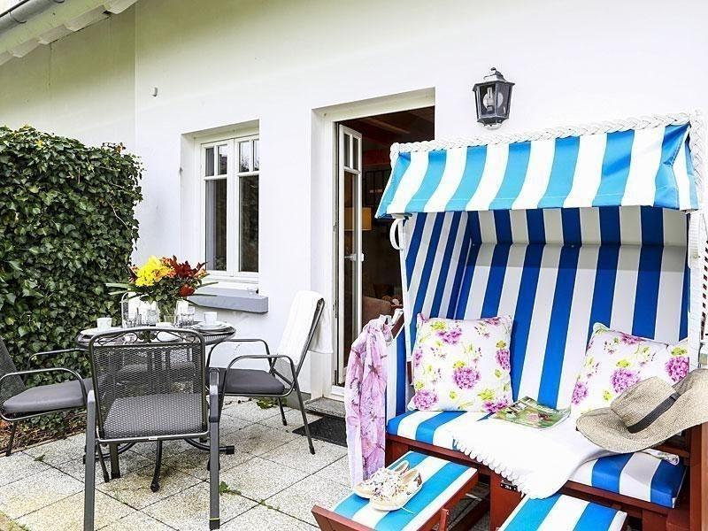 Bequeme Gartenmöbel sowie ein hübscher Strandkorb für das maritime Flair sorgen für erholsame Stunden mit der ganzen Familie.
