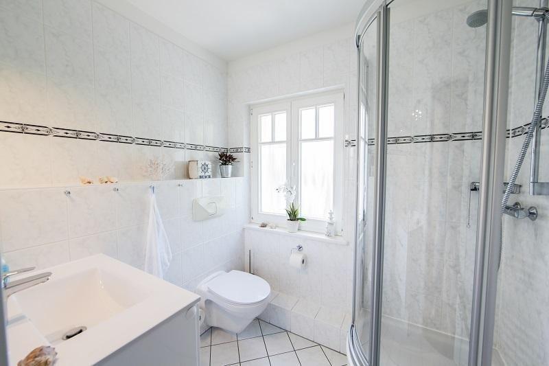 Ebenso auf dieser Ebene befindet sich das Badezimnmer, ausgestattet mit einer Dusche, einem WC, einem Waschbecken mit Unterschrank sowie Ablageflächen für Ihre Badutensilien.
