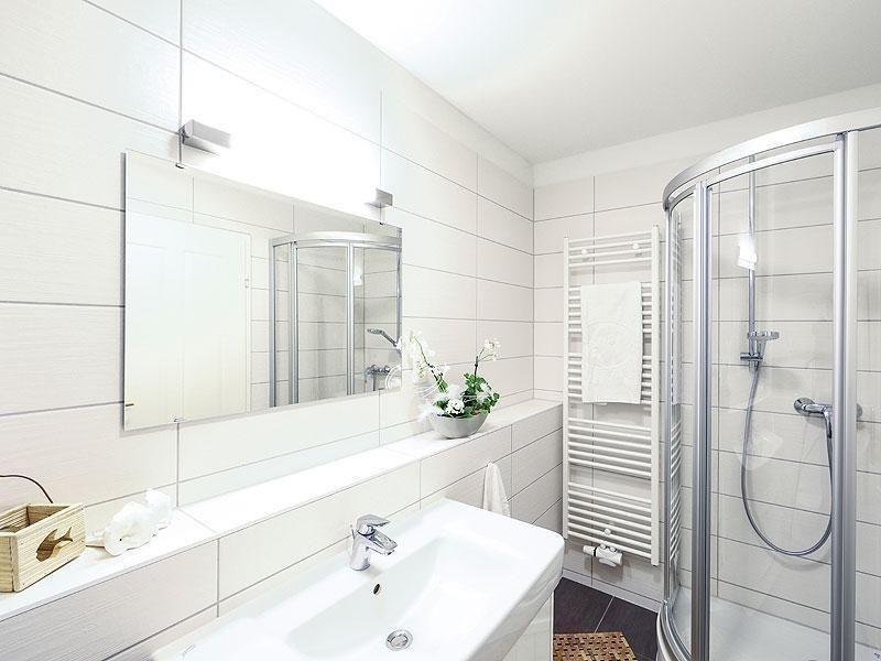 Das Badezimmer auf dieser dieser Ebene verfügt über eine Dusche, ein WC, einen Handtuchheizkörper, ein Waschbecken mit Unterschrank sowie ausreichend Ablagefllächen für Ihre Badutensilien.