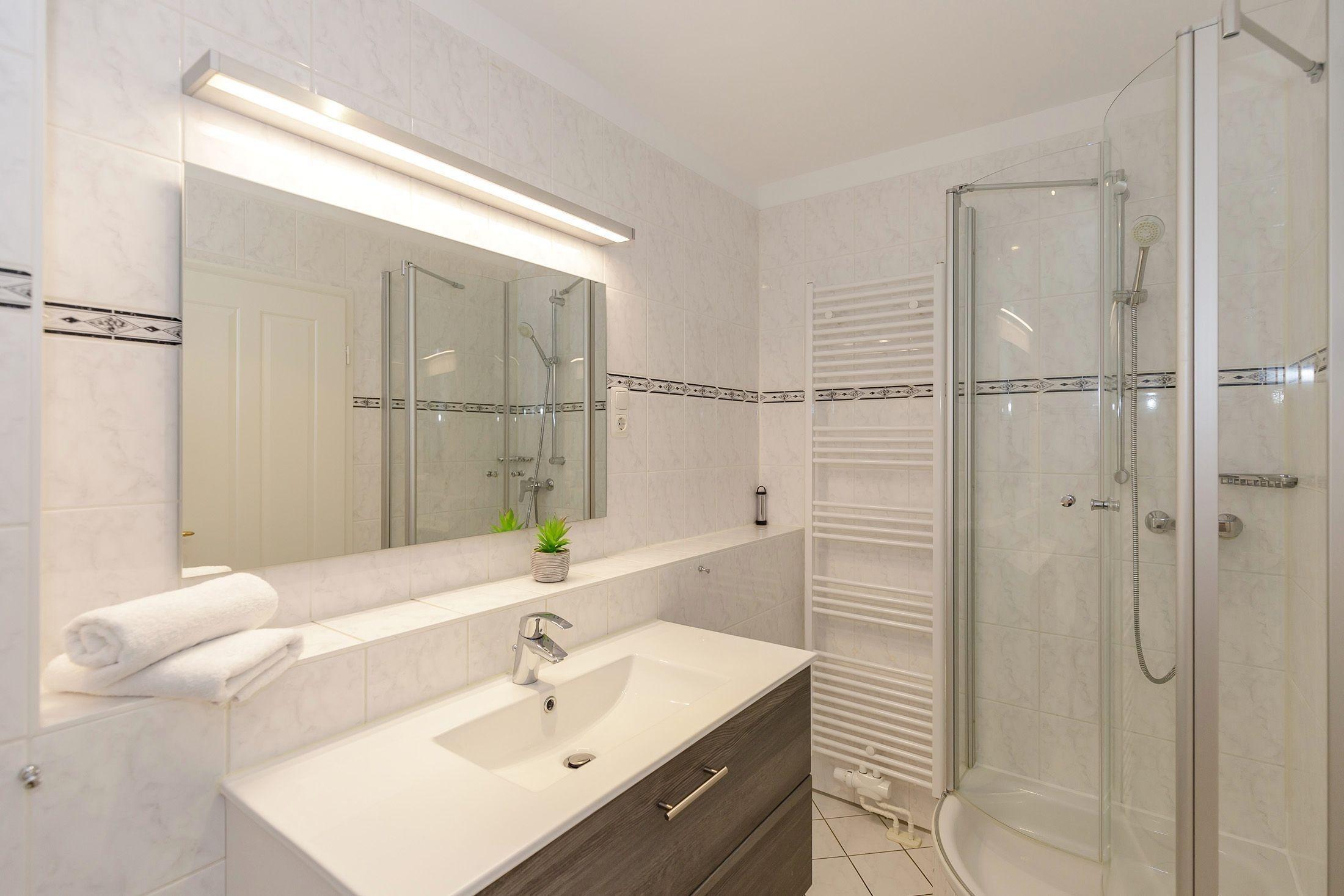 Ebenso im Obergeschoss befindet sich das Badezimmer. Dieses verfügt über eine Dusche, ein WC, ein Waschbecken mit Unterschrank, einen Handtuchheizkörper sowie genügend Ablagemöglichkeiten für Ihre Badutensilien.