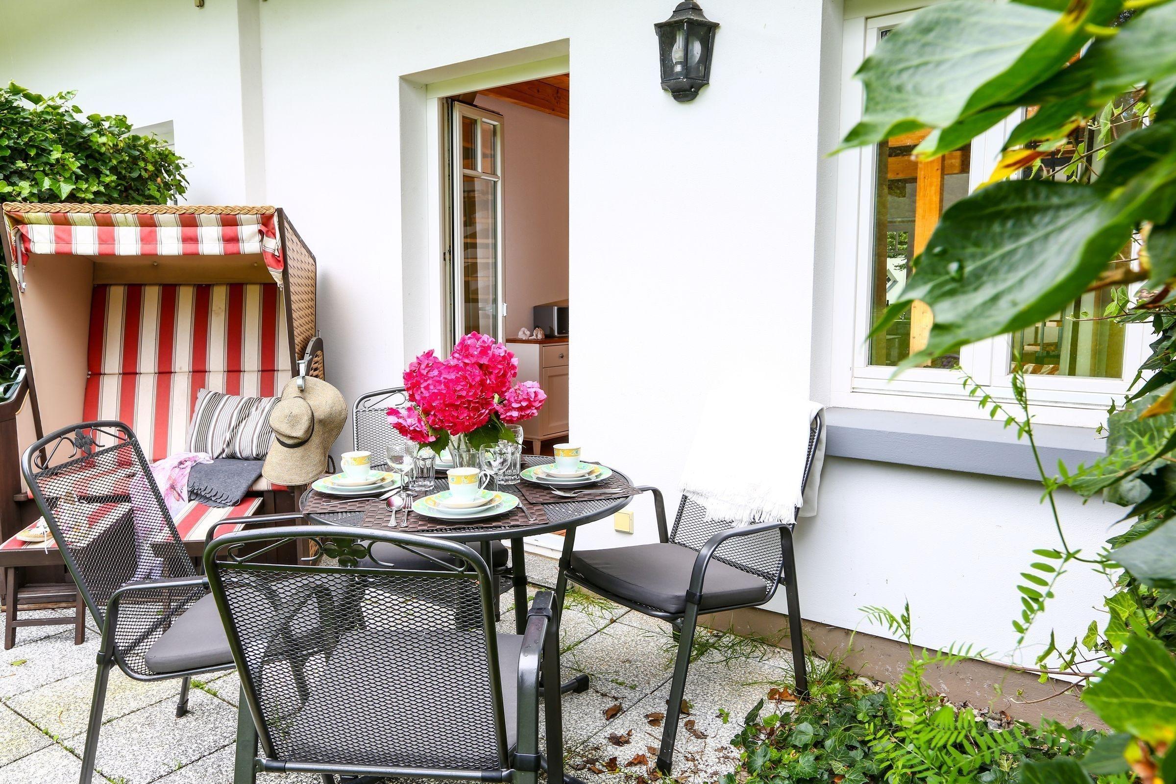 Moderne Gartenmöbel und ein hübscher Strandkorb laden zum gemütlichen Verweilen ein und vervollständigen das harmonische Ambiente im Außenbereich des Hauses.