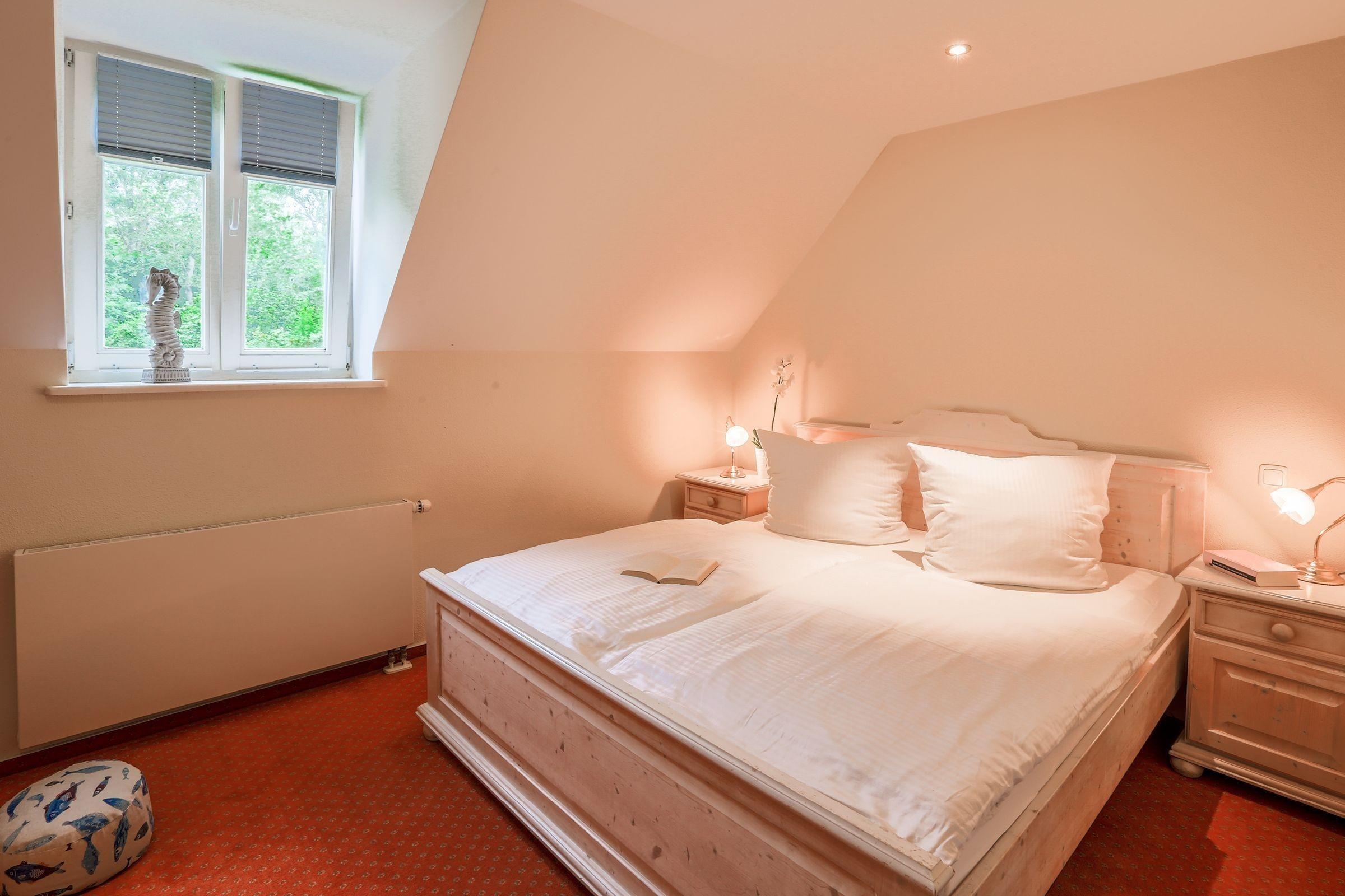 Über eine Wendeltreppe gelangen Sie in das Obergeschoss des Hauses. Zwei getrennte Schlafzimmer befinden sich in diesem Bereich, eines ist mit einem bequemen Doppelbett, das zweite mit zwei Einzelbetten eingerichtet. In jedem Zimmer befindet sich je ein Kleiderschrank für Ihre Urlaubsgarderobe.